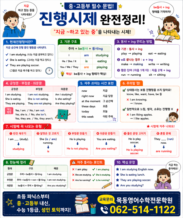 태봉초, 용주초, 하백초, 경신중, 중앙중, 용봉중, 운암중 경신여고, 금호고, 중앙여고, 동신여고, 문정여고, 광주여고 전사고, 국제고, 고려고, 전남외고 등 학교별 부교재 완벽분석! 내신1등급! 원장자체제작 시험대비 분석본 제공! 진행시제 완전정리 (현재진행형 중심 + 시험에 꼭 나오는 유형) 영어에서 진행시제는 **“지금 ~하고 있는 중”**이라는 의미입니다. 1. 현재진행형이란? 지금 진행 중인 행동 I am studying → 나는 지금 공부하고 있다 She is eating → 그녀는 지금 먹고 있다 2. 기본 구조 주어 + be동사 + 동사ing I am playing He is running They are studying 핵심 be동사 + ing....... <img src="https://blogthumb.pstatic.net/MjAyNjA0MzBfMjYz/MDAxNzc3NTM4NjcxMDY2.P1L4BadlAis_nS57hKe0y9XX6Cs7A_PGhd0fs9ET3jUg.0Lt5l3RDHZq1C2VqeyPKcWHLd0d8Xczo2nN7lsJX0Kcg.PNG/%C1%F8%C7%E0.png?type=s3" />