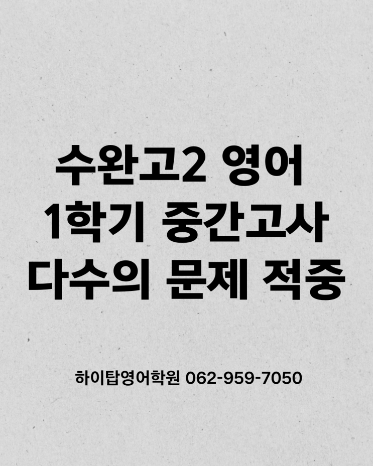 이번 수완고등학교 고2 영어 중간고사가 마무리되었습니다. 시험 직후 학생들과 함게 문제를 분석해보니, 학원 수업 시간에 반복적으로 다뤘던 내용들이 실제 시험에 그대로 반영된 것을 확인할 수 있었습니다!! 영어 내신에서 어법 문제는 단순 암기로 해결되지 않습니다. 학교별 출제 스타일을 이해하고, 자주 나오는 문법 포인트를 정확히 정리해야 안정적으로 점수를 받을 수 있습니다. 오늘은 이번 수완고등학교 고2 중간고사 영어시험이 어떻게 출제되었는지, 그리고 어떻게 대비해야 하는지 자세히 살펴보겠습니다! 아래의 모든 수업 이미지들은 저희 하이탑에서 다룬 실제 수완고 내신 대비 과정이며 시험문제와 모두 적중하였습니다!! 4....... <img src="https://blogthumb.pstatic.net/MjAyNjA0MzBfMjk3/MDAxNzc3NTUwMDIxOTU5.In9SxL4Tbme3Ld4T4-7yOrF9TEGPUe-YEqqIdkCqv0og.TpwJm1glAD9awrzO802SOkfkWfNoE7qL2fWbX2WheBgg.PNG/%C7%CF%C0%CC%C5%BE%BF%B5%BE%EE%C7%D0%BF%F8_%2819%29.png?type=s3" />