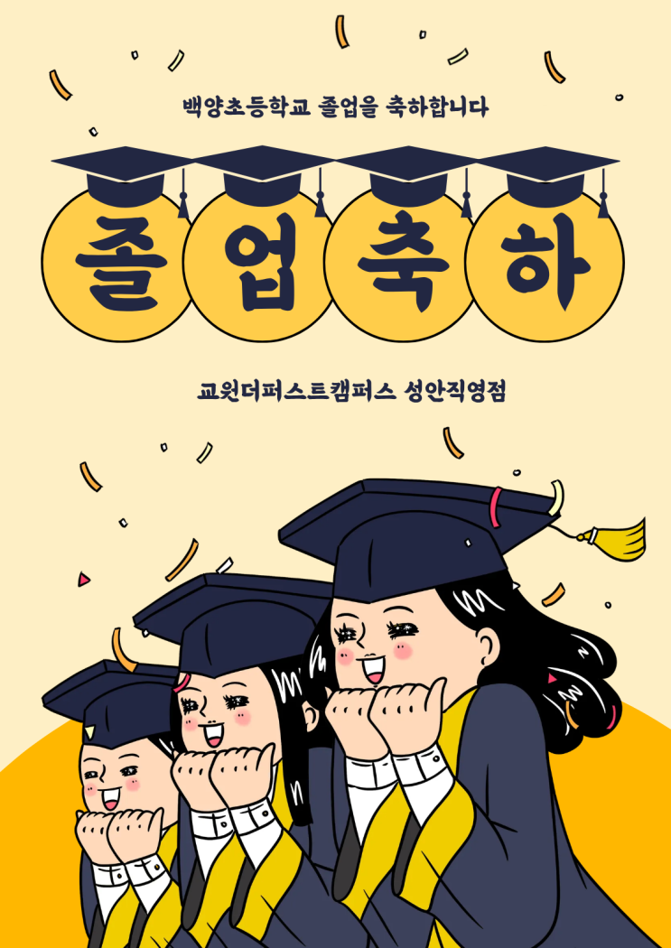 안녕하세요. 교원더퍼스트캠퍼스 성안직영점입니다. 저희는 오늘, 선생님들과 함께 이번에 졸업하는 우리 아이들을 직접 만나기 위해 백양초등학교 졸업식 현장에 다녀왔습니다!! 초등학교 6년을 마무리하는 자리에서 졸업식 옷을 단정히 입고, 학사모를 쓴 아이들의 모습을 보니 불과 얼마 전까지 교실에서 장난치던 모습이 겹쳐지며 괜히 더 의젓해 보이고, 대견한 마음이 들었답니다 ㅎㅎ 아이 한 명, 한 명의 얼굴에 “이제 정말 중학생이 되는구나”라는 설렘과 긴장이 함께 느껴졌고, 그만큼 이 시기가 아이들에게 얼마나 중요한 전환점인지 다시 한번 느끼게 되는 순간이었습니다. 초6 겨울방학, 절대 소홀히 하면 안 되는 이유 많은....... <img src="https://blogthumb.pstatic.net/MjAyNjAxMjFfMTc5/MDAxNzY4OTk1MzEyNjk4.ZCkT2zuJGgvkRMt2QwIQDeAC9dTlF6F3sVggb550w10g.a_ctGHZFeCslXPoFPctiZtnAmdJ1315fFRaV6v5AOQYg.PNG/%C1%A6%B8%F1%C0%BB_%C0%D4%B7%C2%C7%D8%C1%D6%BC%BC%BF%E4._%287%29.png?type=s3" />