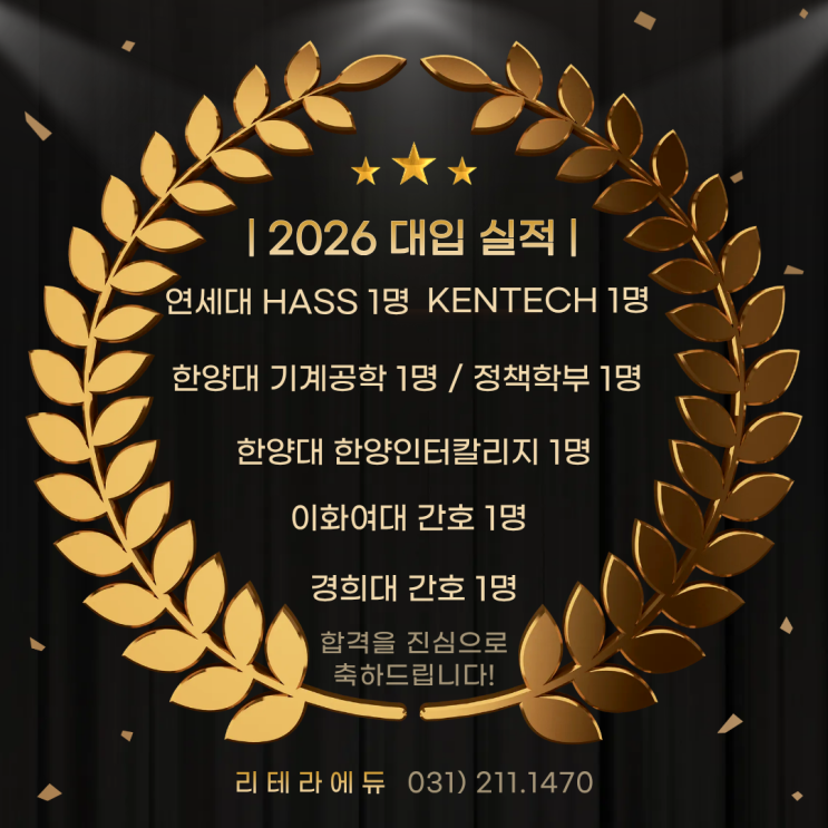 2026학년도 대입 전형이 이제 어느 정도 마무리 되어 가고 있습니다. 일부 대학에서 정시전형 추가모집이 있겠지만 2026학년도 입시가 거의 마무리 되었다고 볼 수 있습니다. 2026학년도 대입은 그 어느 때 보다 힘들었습니다. 불수능 뿐만 아니라 수험생의 증가로 인하여 그 어느 해보다 예측이 어려웠습니다. 그럼에도 불구하고 리테라에듀와 함께 한 우리 학생들의 입시 성과는 우수하다고 자부할 수 있습니다^^ 연세대를 비롯하여 켄텍 한양대 중앙대 이화여대 경희대 동국대 등 상위권 대학 합격자들이 많았고 합격 소식을 오매불망 기다리던 학생과 학부모님 모두 고생 많으셨습니다! 리테라에듀 역시 학생과 학부모님 못지 않게 마음 졸이....... <img src="https://blogthumb.pstatic.net/MjAyNjAyMTRfMTc4/MDAxNzcxMDQ2ODIwNDcz.k3IOb_2PwQoNMnB7Wxqd9r4RAoEff_C8u6dJOsZ_0RQg.PhjkHpROcQPq5cW8LPL19QPBYTfNrx0-GtSVQRAzpqsg.PNG/%C1%A6%B8%F1%C0%BB_%C0%D4%B7%C2%C7%D8%C1%D6%BC%BC%BF%E4..png?type=s3" />
