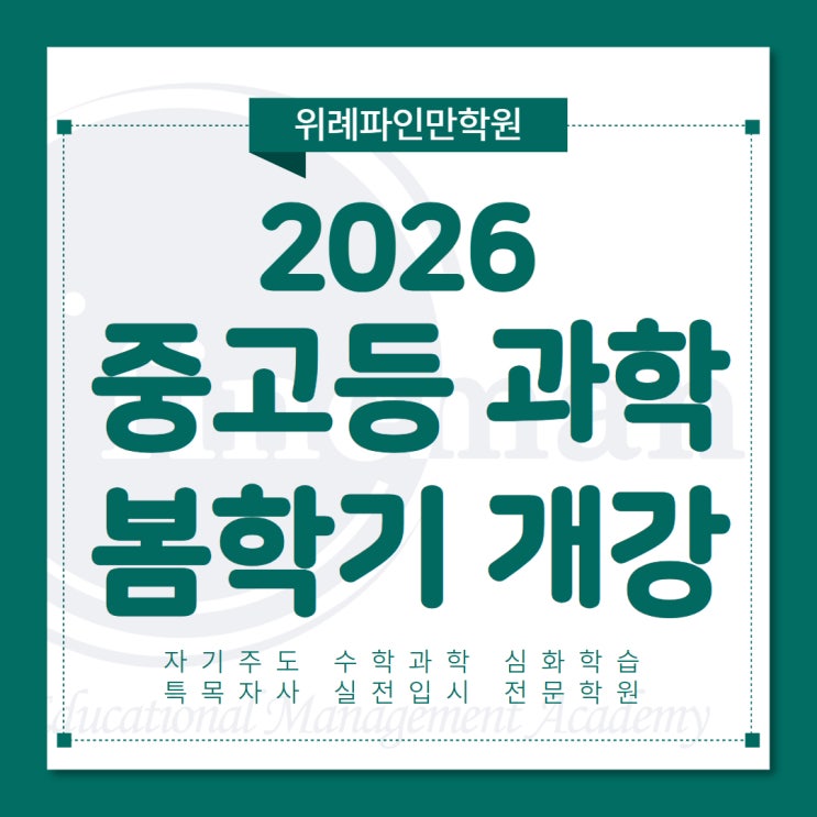 안녕하세요! 위례파인만입니다! 중등부터 고등까지, 과학 학습의 흐름을 설계합니다! 새 학기가 시작되는 봄, 과학은 학년이 올라갈수록 난이도와 역할이 분명히 달라지는 과목입니다. 중등은 개념 구조와 학습 습관, 고1은 내신 적응과 시험 전략, 고2는 성적+진로 연계 위례파인만학원 과학과는 학년별로 필요한 과학 학습의 방향을 명확히 나누어 2026 봄학기 과학 정규반을 개강합니다! 3/7(토), 3/8(일), 3/11(수) 개강! ▼중고등 과학 봄학기 수강신청 링크▼ https://forms.gle/NKnC8GsXoN2uVWnC9 중등 과학 정규반 중등 과학은 단순 암기가 아니라 개념 이해력 + 문제 해석력을 만드는 시기입니다. 위례파인만 중등 과학 수업 특징 학년....... <img src="https://blogthumb.pstatic.net/MjAyNjAyMDlfMTM1/MDAxNzcwNjM1MzA2ODgw.x85Idoh6FC9U5CvhJm52LL-Hv-B82JLSaNc-lAWeLuEg.nMzRqSJeFiBZnovq2HitZ_EcY7YaQWfqbeADYT9hBtYg.JPEG/%C0%A7%B7%CA_%B0%FA%C7%D0%B0%FA_%BD%E6%B3%D7%C0%CF_%BB%F9%C7%C3.jpg?type=s3" />