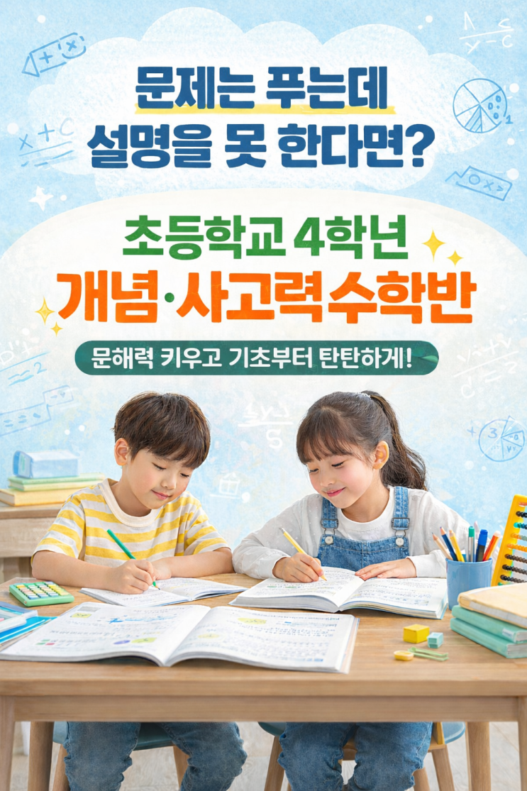 초4 개념•사고력 수학반 모집 안내 "문제를 푸는데, 설명을 못 해요."" 초4 학부모 상담에서 가장 많이 듣는 이야기입니다. 연산은 빠른데 문장제에서 흔들리고, 조금만 응용되면 막히는 이유는 단순한 실수 문제가 아니라 개념 이해와 수학 문해력의 부족인 경우가 많습니다. 수학의힘 위례 초4 신규반은 빠른 선행보다 이해 중심의 수학 시작에 초점을 맞춘 반입니다. 개념 완성 + 사고력 확장 집중반 초4는 수학 난이도가 한 단계 올라가며 개념을 제대로 이해하지 못하면 이후 학년에서 계속 부담이 누적되는 시기입니다. 그래서 수학의힘 초4 반은 단순 문제 풀이식 수업이 아닌 개념을 이해하고 설명할 수 있는 수업으로 진....... <img src="https://blogthumb.pstatic.net/MjAyNjAyMTNfMjYg/MDAxNzcwOTcxOTY3MjY0.gkZnkNY2J4424hO3vZn_tBefoCx0E3QHVSNs-U8uNlkg.GXfprYyaexXSecY9d00heHWLJn4Dh46jg7kRZcX0sDUg.PNG/%C3%CA4_%BD%C5%B1%D4%B9%DD_%BE%C8%B3%BB_%BD%E6%B3%D7%C0%CF.png?type=s3" />