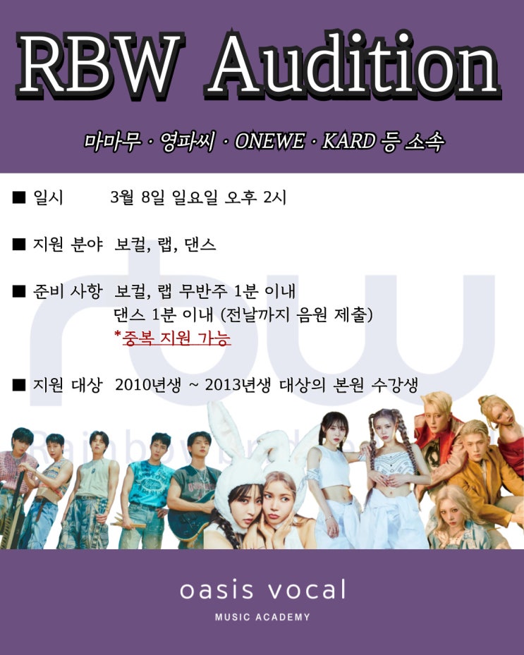 안녕하세요 오아시스보컬 음악학원입니다 :) 오늘은 바로! 알비더블유의 내방 오디션 소식을 알려드리려 합니다 3월 8일 일요일 오후 2시! 분당보컬학원 오아시스보컬에서 알비더블유 내방 오디션이 진행된다는 사실~ 많은 관심과 참여 부탁드립니다 :) 알비더블유는 한국 최고의 프로듀서들이 모여 설립한 종합 엔터테인먼트 기업이에요 설립 이후 마마무, VROMANCE, 원어스, 원위, 퍼플키스, NXD 등 개성 있는 아티스트들을 배출하였습니다 전 세계인들이 공감할 수 있는 양질의 콘텐츠 제작을 목표로 엔터테인먼트 산업에 대한 새로운 패러다임을 제시하고 있으며, 엔터테인먼트 산업의 새로운 영역을 선도하는 핵심 리더로서 자리매김하고 있....... <img src="https://blogthumb.pstatic.net/MjAyNjAzMDVfMjY1/MDAxNzcyNzAyNTkyMDk4.Rz8pb1YMkwDT0R41kVGhwnrSX1dTVbrI8O1YTiOymYkg.yeyfsjZupV0YDu7JHX6ZN_GAshcDgzr3K5jGDp_jN7wg.JPEG/%B9%CC%BD%BA%C6%BD-%BF%C0%B5%F0%BC%C7-%B5%F0%B7%BA%BC%C7-001.jpg?type=s3" />