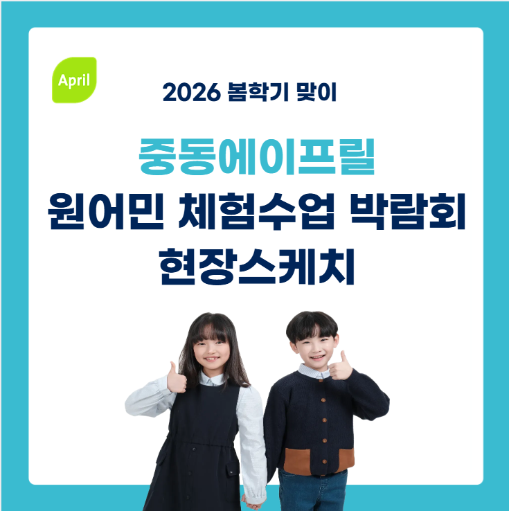 안녕하세요, 부천중동에이프릴어학원 입니다! 2/21(토) 봄학기 맞이 원어민 체험수업 박람회가 진행되었습니다. 중동에이프릴에 방문주신 모든 학부모님과 학생들에게 감사의 말씀 전합니다. :) [중동에이프릴 강사진] 중동에이프릴에서는 강사진의 주기적인 실력 점검 및 워크샵이 진행됩니다. 누구보다 열정적으로 수업에 임하는 최강 강사진! [대표 레벨 수업체험] 우리 학생들과 학부모님 모두 즐겁게 참여하여 매우 밝은 분위기에서 수업이 진행되었습니다! 영어 학습도 하고 맛있는 캔디도 받고~ 우리 학생들의 자신감이 쑥쑥! [입학세미나] 중동에이프릴에 대한 상세한 안내가 이루어지는 입학세미나! 유익한 정보를 얻을 수 있는 절호의....... <img src="https://blogthumb.pstatic.net/MjAyNjAyMjFfMjcz/MDAxNzcxNjQ2NDY1MjEw.5qMaywPPUZ0z-7Ez3f5--piLUrpDITeLtoufy2ejTEgg.breYj__VuIg0W-JKstgzLG5Mfc-Ns0dkYgpC6M_ZC0Eg.PNG/image.png?type=s3" />