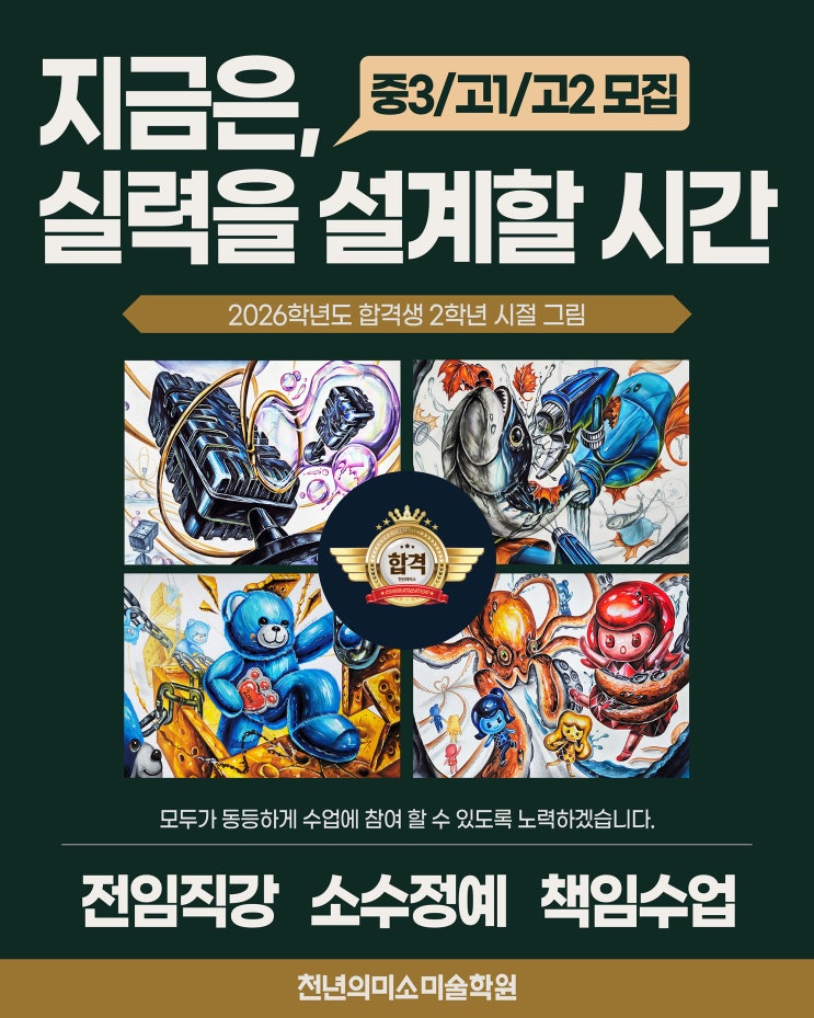 소수정원제 / 책임수업 소수이기에 부천천미는 모든학생들이 수준높은 미술교육을 받을 수 있습니다!! 26년 부천천년의미소 예비반 신입생을 모집합니다. 미대입시를 희망하는 중3/ 고1 / 고2 부천천년의미소미술학원은 입시반 원장직강과 예비반 전임직강으로 진행이되며, 많은학생이 아닌 정원제를 통해 교육의 질을 높이며, 입시반과 연계수업을 통해 예비반학생들이 입시의 흐름을 이해하게 하고 있습니다!! 입시는 기본기가 중요합니다!! 아무리 화려하고 빨라도 채점자들의 관점과 다르면 의미가 없어요!! 부천천미는 초반에 철저히 개인별로 접근합니다!! 첫 시작을 부천천미와 한 학생들의 98%가 합격할 수 있는 가장 중요한 부분중 하나....... <img src="https://blogthumb.pstatic.net/MjAyNjAyMTdfMTU1/MDAxNzcxMzE4ODc4NDMz.oLakFodYn8NU8dMz1YQVk0xhbY_H-6NLMWQyqcCR2b8g.h8mCe3fB6gpc8FmUhlTZ6114wE9awV-etF3JZO3pIYwg.JPEG/%BA%CE%C3%B5%C0%D4%BD%C3%B9%CC%BC%FA%C7%D0%BF%F8%28%BF%B9%BA%F1%B9%DD%29-1-01.jpg?type=s3" />