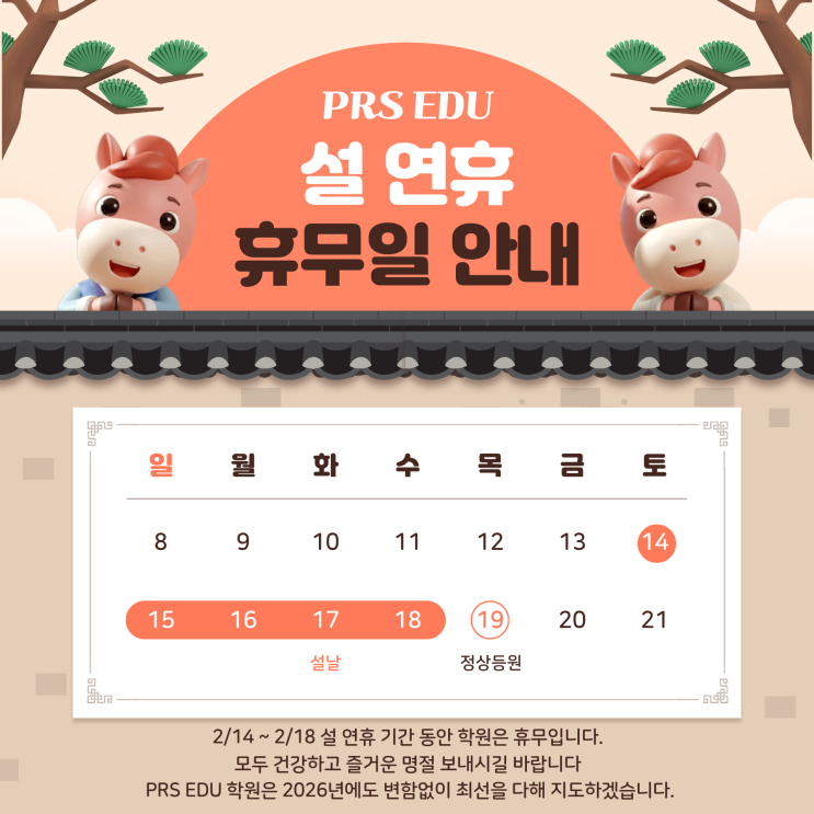 안녕하세요. PRS EDU 학원입니다. 2026년 설 연휴를 맞아 학원은 연휴 기간 동안 휴무합니다. * 연휴 기간 : 2월 14일(토) ~ 2월 18일(수) * 2월 19일(목) 부터 '정상 등원'입니다 * 항상 믿고 소중한 아이들을 맡겨주시는 학부모님들께 진심으로 감사드립니다. 가족과 함께 따뜻하고 풍요로운 설 연휴 보내시길 바라며, 새해에도 아이들의 성장을 위해 최선을 다해 지도하겠습니다. 감사합니다. 상담문의 031.362.5032 중고등관 031.480.2128 초등관 <img src="https://blogthumb.pstatic.net/MjAyNjAyMDlfMTg0/MDAxNzcwNjE2OTI5NTcy.QgfblMUSYRrCqKwj2gaRHUlsKsCKphmyaT4CVYlrYXIg.v_PRavIvwOQDUBAn_FrTlWM9bYkxzR1M921SGRAOrs8g.PNG/%BC%B3%BF%AC%C8%DE_%C8%DE%B9%AB%C0%CF_%BE%C8%B3%BB.png?type=s3" />