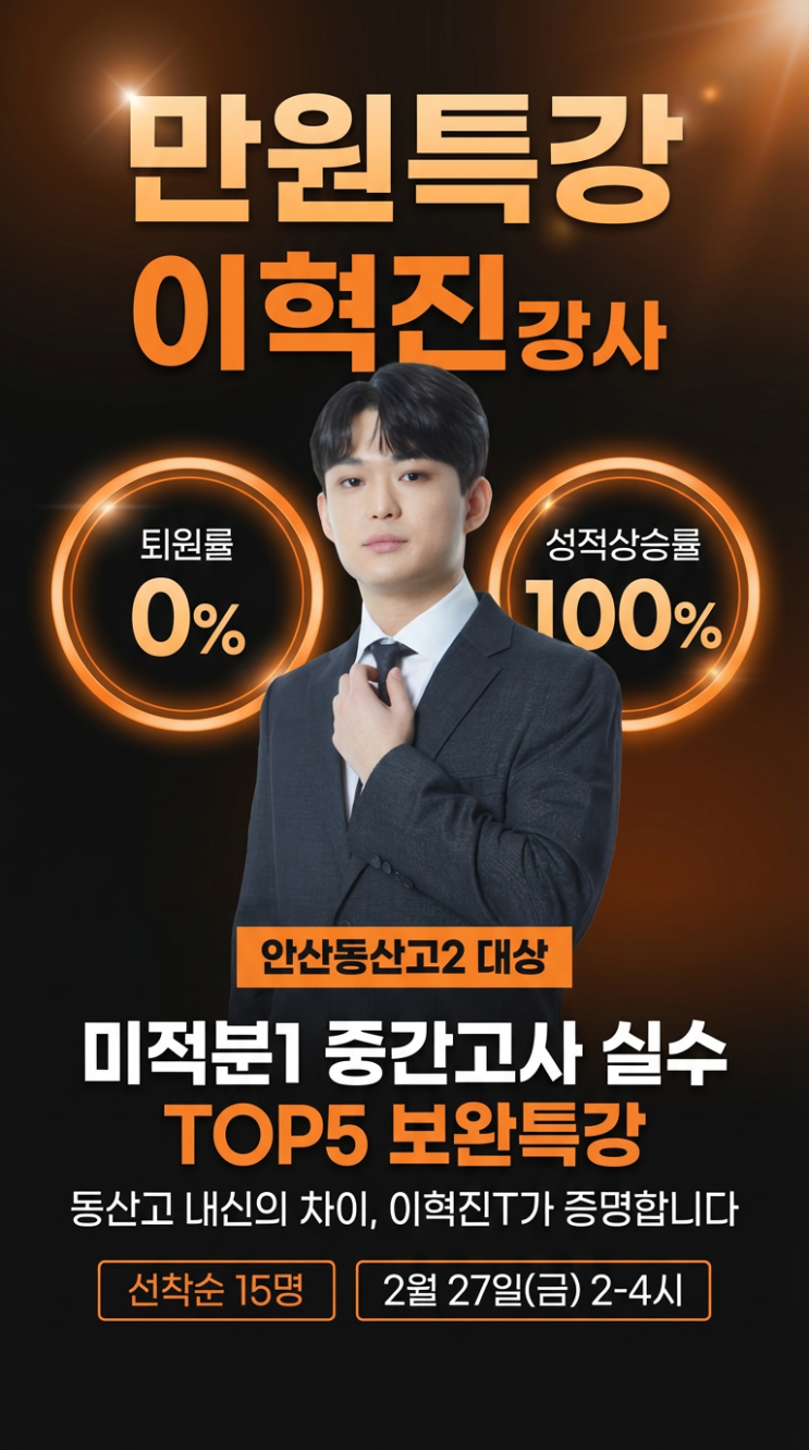 미적분1 중간고사 실수 TOP5 보완 특강 안내 시험에서 등급이 갈리는 이유는 새로운 개념이 아니라 반복되는 실수입니다. 아는 문제를 틀리지 않게 만드는 것만으로도 실제로 2~3문제를 더 맞출 수 있고, 그 차이로 내신 등급이 달라집니다. 이번 특강에서는 중간고사에서 학생들이 가장 많이 틀리는 대표 실수 유형 5가지를 선별해 ✔ 왜 틀리는지 핵심 원인 정리 ✔ 시험에서 바로 쓰는 체크 루틴 ✔ 실수 줄이는 풀이 구조 만 집중적으로 정리합니다. ■ 강사 : 각인 이혁진 선생님 퇴원율 0%, 성적 상승률 100%로 동산고 내신의 차이를 만들어온 강사입니다. ■ 특강 내용 1. 함수의 극한 0/0꼴 응용 2. 평균변화율과 순간변화율의 차이 3. 곱....... <img src="https://blogthumb.pstatic.net/MjAyNjAyMTJfMjIw/MDAxNzcwODk2MDg4MTMw.UKUUs3I945_bja-fRwhtUGepcxlBSYYqh0zo8M0M6e4g.PjjjJAqwo3X-iYWuM9IF2c0RY1__PyN5GxUilBz6nmEg.PNG/%C0%CC%C7%F5%C1%F8%BB%F9_%B8%B8%BF%F8%C6%AF%B0%AD%28%BC%BC%B7%CE%29.png?type=s3" />