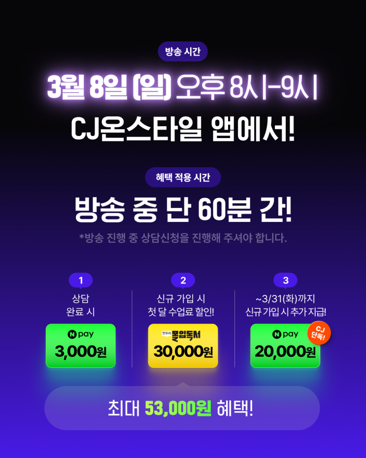 한우리가 만든 초등 읽기 전문 브랜드, '한우리 몰입독서'를 아주 특별한 혜택으로 시작하실 수 있도록, CJ온스타일 단독 라이브 방송 소식을 안내해 드립니다! 라이브 방송 일정 (CJ온스타일 앱 접속!) 3월 8일(일) 오후 8시 ~ 9시 (단 60분간!) 방송 중 단 60분! 최대 53,000원 혜택 오직 라이브 방송 중에만 누리실 수 있는 역대급 혜택 3가지를 챙겨가세요! ✅ 전화 상담 완료 후 10일 이내 네이버페이 3,000원 지급! ✅ 신규 가입 시 첫 달 수업료 30,000원 즉시 할인! ✅ 3/31(화)까지 신규 가입 시 네이버페이 20,000원 추가 지급! ⏰ 3월 8일(일) 저녁 8시, 알람 맞춰두시고 놀라운 혜택을 절대 놓치지 마세요! ✅ 본....... <img src="https://blogthumb.pstatic.net/MjAyNjAzMDJfOSAg/MDAxNzcyNDUwNzI0MTYy.2mJ-3o7-p0tIm_UVK7gDwXC5JNQcED_wW5Qt3h_YSlYg.w8RGsna5UWRN3qu0Vo0_fzQKPGxSCyWjoub4dkGtWgcg.PNG/%C0%CE%BD%BA%C5%B82.png?type=s3" />