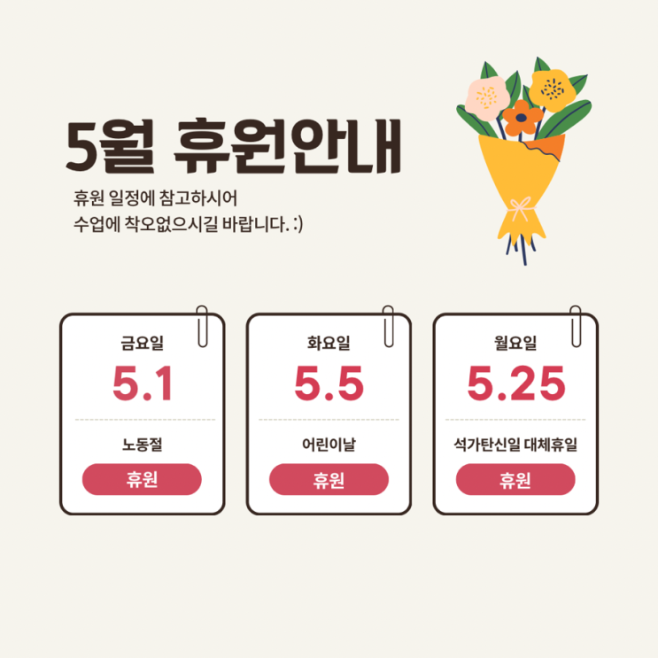 5월 휴원안내와 어린이날 파티 안내문 입니다:)