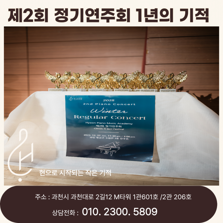 안녕하세요. 과천 피아노 학원 현피아노입니다. 지난번 현피아노의 제2회 연주회에 관한 포스팅을 하였는데요. 드디어 연주회 때 찍은 영상과 사진들이 이제야 정리가 되었네요. 그래서 오늘은, 매주 성실하게, 묵묵히, 그리고 꾸준히. 그 시간의 힘이 이번 정기연주회에서 빛났던 연주자들의 영상으로 우리 아이들이 얼마나 성장했는지 기록을 남겨보려 합니다. 영상 속에서 아이들의 1년 전 모습과 현재 모습을 함께 담았습니다. 직접 보시면 더 놀라실 거예요. 1년의 시간, 아이들은 이렇게 달라졌습니다. 1년 전 ↓ 1년 후 ↓ 1년 전 ↓ 1년 후↓ 1년 전↓ 1년 후↓ 1년 전↓ 1년후↓ 1년 전↓ 1년 후↓ 1년 전↓ 1년 후↓ 그 외에 멋진 연주....... <img src="https://blogthumb.pstatic.net/MjAyNjAyMTlfMTM2/MDAxNzcxNDY4NzgxODUz.ilabvXgmYDCDXqwLrljeHSDwHYffqsiQsx9icBBRRBcg.XMphvXiVhsiZWR8EZz_lZyS-67ZMeqb_zrfki_nWZMEg.PNG/%C1%A4%B1%E2%BF%AC%C1%D6%C8%B8_1%B3%E2%C0%C7%B1%E2%C0%FB.png?type=s3" />