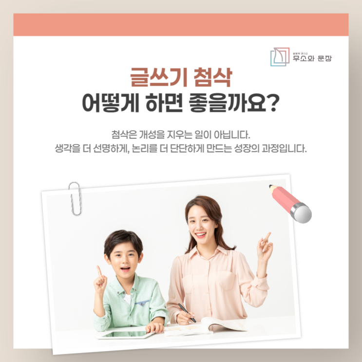 안녕하세요 "언어 영재로 키웁니다" "언어의 뿔, 문장의 힘" 문해력 연구소! 과천 독서논술학원 무소와 문장입니다. 글쓰기 첨삭 어떻게 하면 좋을까요? 글쓰기 실력을 키우는 데 있어 가장 중요한 과정은 무엇일까요? 바로, 자신의 글을 객관적으로 점검받는 교사의 첨삭 지도입니다. 최근에는 학생 개개인의 개성을 존중해야 한다는 이유로 첨삭을 최소화해야 한다는 의견도 있습니다. 물론 학생의 목소리를 살리는 일은 중요합니다. 그러나 방향 없는 자유는 성장을 담보하지 못합니다. 글쓰기 능력을 발전시키기 위해서는 전문적인 피드백이 반드시 필요합니다. 그렇다면, 좋은 첨삭 지도는 어떻게 이루어져야 할까요? 첫....... <img src="https://blogthumb.pstatic.net/MjAyNjAyMjNfMjY0/MDAxNzcxODIzNzUxOTUy.VBAZShx2DGZBTkPy3LMEwLl-aFyI4cMbIV4HhA9RIE8g.K0Jo_wjYkKCa51AgeY60bPHHm1OnJ8YRngK13_n4VuAg.PNG/%B0%FA%C3%B5_%B5%B6%BC%AD%B3%ED%BC%FA%C7%D0%BF%F8-001_%282%29.png?type=s3" />