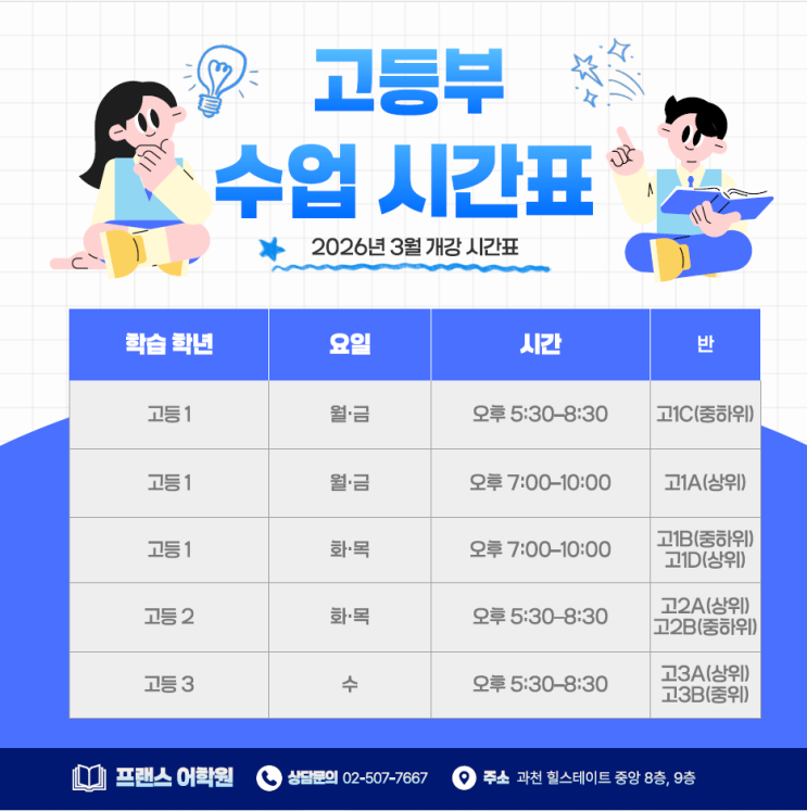 프랜스어학원 고등부 봄학기 개강 수업시간표