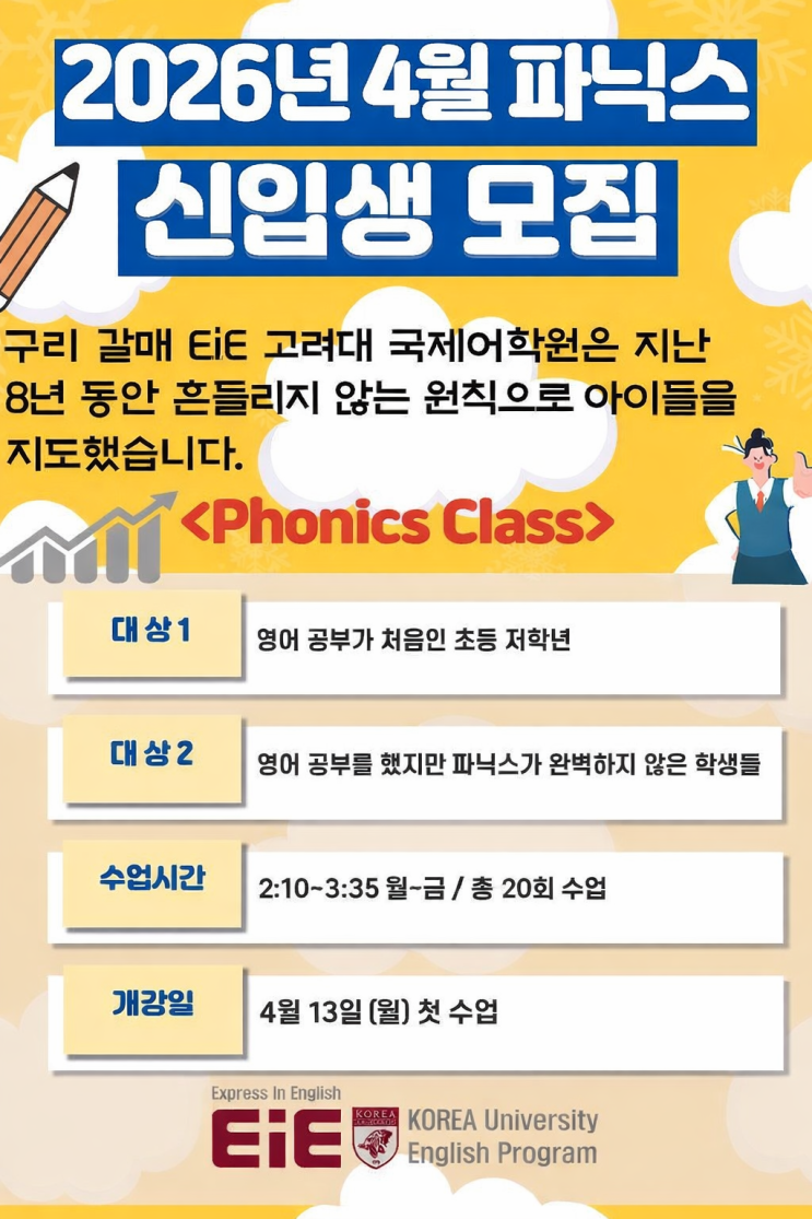 안녕하세요 Mia원장입니다^^ 오늘은 4월에 개강하는 파닉스반 개강 소식 전하려고 합니다~~ 우리 친구들 학교 적응하느라 바쁜 3월을 보내고 있겠죠~~?? 그!래!서! 갈매영어학원 EiE 고려대 어학원에서는 4월에 개강하는 파닉스반은 준비하였습니다!! 초등 영어의 시작!! 제대로 된 파닉스가 아이의 영어 자신감을 만듭니다! 개강할때마다 마감기록!!!했던 EiE 파닉스반~! 지난 8년 동안 갈매에서 검증된 EiE 영어 시스템으로 아이들의 영어 첫 단계를 함께 만들어 가겠습니다~~ 031)567-0579 <img src="https://blogthumb.pstatic.net/MjAyNjAzMTFfMTI5/MDAxNzczMjI1OTA2MzAx.u4QLGwMicemeSy9fcJ5XFzUGp8iUMboL8n3mjw5cTxog.NophLkVTm2ZwFBIYtPZJIQriXf5qwf0ZOJh5LiFegCQg.PNG/4%BF%F9%B0%B3%B0%AD_%C6%F7%BD%BA%C5%CD.png?type=s3" />