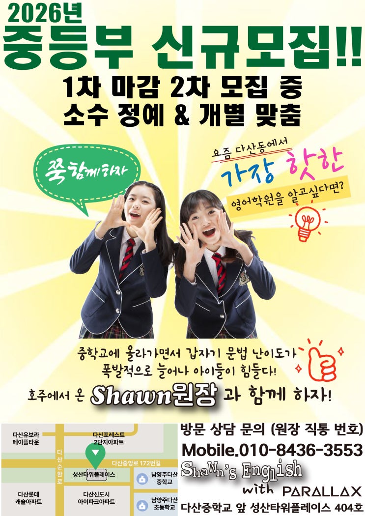 안녕하세요! 다산지앤비(GnB) (초등) & Shawn's English with Parallax (중등) 영어학원의 원장 Shawn입니다! 중학생 영어 내신의 승부는 ‘문법 이해력 + 서술형 Writing 능력’에서 갈립니다. 문제를 정확히 해석하고, 문장의 구조를 스스로 재구성할 수 있는 학생이 진짜 1등급을 얻습니다. 그리고 이것이 바로 제가 수년간 직접 연구하고 가르쳐 온 Shawn’s Writing 기반 문법 시스템입니다. 왜 Shawn's Writing Grammar인가? 문법을 ‘문장 쓰기(Writing)’로 체득 단순 암기가 아닌, 스스로 문장을 만들어 보며 문법 개념이 몸에 남습니다. 서술형 만점에 최적화된 훈련 중등 내신에서 갈리는 부분은 결국 ‘서술....... <img src="https://blogthumb.pstatic.net/MjAyNTEyMDhfMTcx/MDAxNzY1MTY0NTU0NTYw.I76h1ktyUhTtAi8GlTbmRt_iuF4KGjdFGShWTMx95Kwg.bV61H9nxknEuMiMzgDXoHuByg_wY7jAUs7UFUcPns18g.JPEG/2026_%EC%A4%91%EB%93%B1%EB%B6%3F_%3F%8B%A0%EA%B7%9C%EB%AA%A8%EC%A7%3F.jpg?type=s3" />