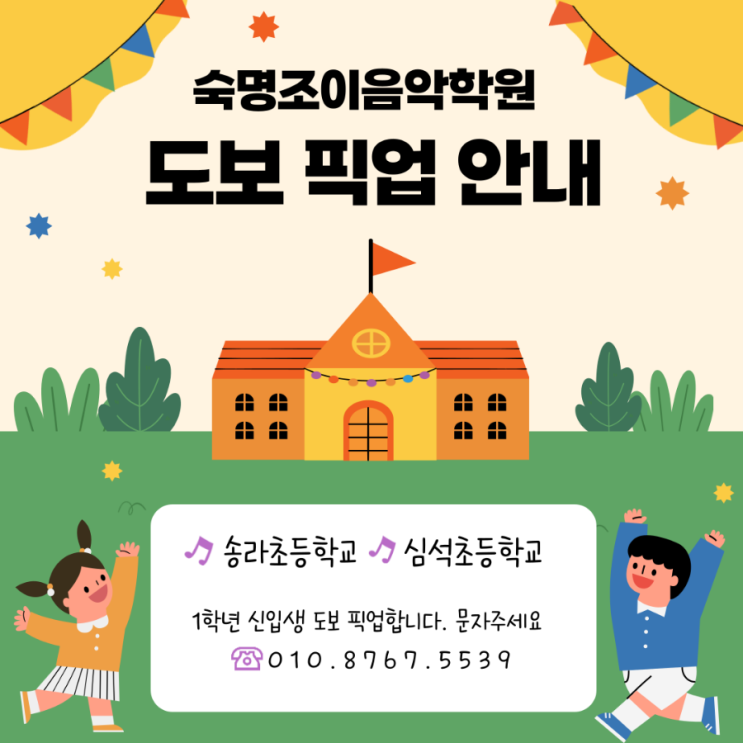 안녕하세요, 숙명조이음악학원입니다 2026년 3월 새학기를 앞두고 학부모님들께서 가장 많이 문의 주시는 신입생 도보 픽업에 대해 안내드립니다. 아이들이 처음 시작하는 학원 생활인 만큼 안전하고, 안정적으로 적응하는 것이 무엇보다 중요하다고 생각합니다 도보 픽업 대상 학교 송라초, 심석초 ⭐ 1학년 신입생에 한하여 도보 픽업이 가능합니다. 하원 시간을 문자로 보내주시면 선생님이 맞추어 안전하게 픽업합니다. ⭐ 송라초는 4교시, 5교시 하원 기준으로 픽업이 가능하며 방과후 수업 이후 시간은 이동 동선과 수업 준비 관계로 픽업이 어려울 수 있습니다. (필요 시 사전 상의 후 진행) ⭐ 픽업을 희망하시는 경우 원활....... <img src="https://blogthumb.pstatic.net/MjAyNjAyMTJfMjgg/MDAxNzcwODg3MjI3NTQz.r6YvqSHHziNhQAj5Bh31s2UNbUtv48GJ31CNq4nfh-wg.kh_3chBlWVaGl44fEuYGIj-45eY9-cYxagXckddyiusg.PNG/900%A3%DF1770885636659.png?type=s3" />