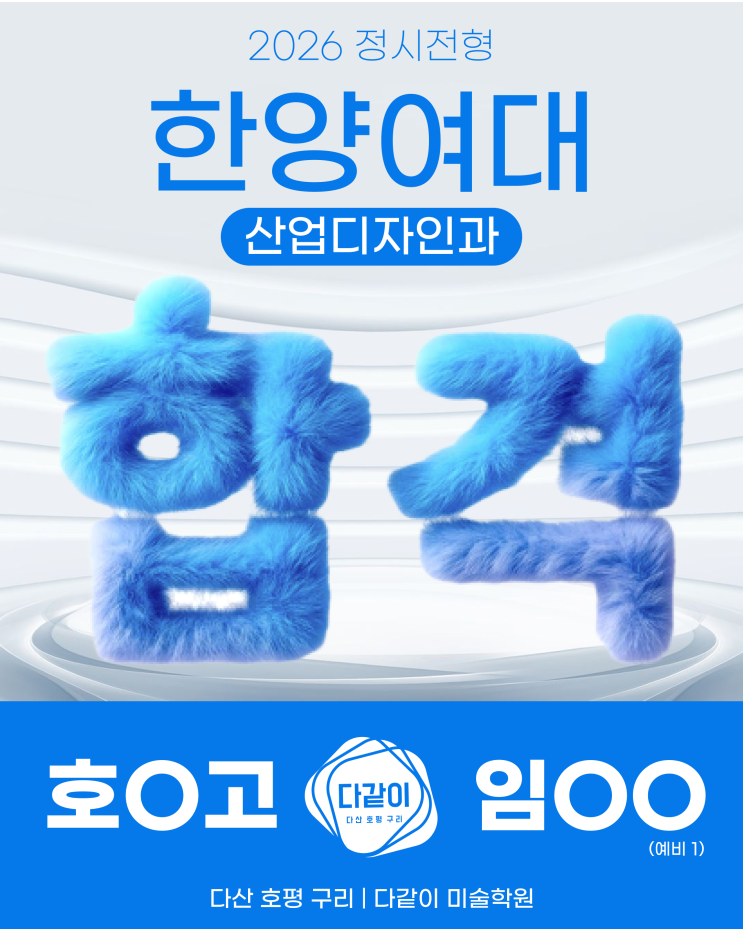 2026 한양여자대학교 정시 합격 소식! 다같이 미술학원의 정시 합격 소식을 전해드립니다! 산업디자인과 임OO 호O고 제품에 생명력을 불어넣는 산업디자인과 합격을 축하합니다! 사람과 기술을 잇는 따스한 디자인으로 새로운 세상을 만들어가는 미래의 임OO 학생을 응원합니다. <img src="https://blogthumb.pstatic.net/MjAyNjAyMTRfMTkg/MDAxNzcxMDQ3Mjk4ODM4.oEhH1DBEYwsQW9EUDbVrc_Gpig7GF0x2ixyko_TBO5Mg.d7Wfm3fnDLhjPy_BOmXr1uMoPlsG3ypy7_PieW-xn4Ug.PNG/%C7%D1%BE%E7%BF%A9%B4%EB_2.png?type=s3" />