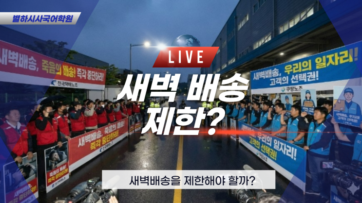안녕하세요~ 별하시사 국어학원입니다. 설날을 앞두고 입춘을 지나 매서웠던 추위도 점차 무뎌지고 있는 것 같네요. 그만큼 우리의 새 학년도 눈 앞으로 다가왔다는 뜻이겠죠? 그런데 만약 개학 전날 밤에 준비물을 사지 못했다는 것을 깨달았다면, 어떻게 해야 할까요? 상상만 해도 끔찍한 상황이네요.. 이럴 때 우리를 구해줄 수 있는 것이 바로 새벽배송입니다. 새벽 배송 서비스의 발전으로 인해 우리는 이렇게 늦은 저녁 주문한 물품도 다음 날 새벽에 받을 수 있게 되었답니다. 그런데 이렇게 편리한 장점 이면에는 다양한 문제점이 숨어있는데요. 정부에서는 이를 해결하고자 새벽 배송을 제한하는 법안에 대해 열띤 논의를 하고 있습니다....... <img src="https://blogthumb.pstatic.net/MjAyNjAyMTRfMjg3/MDAxNzcxMDUxNzQzMTYx.QTs1PFqOU56jzJVlNqdU2Y8qdcf5I6B7cLffMOF8WtEg.0RmBFuFst1Botsso_BBP71CI7ldH-IEcmk1UoSgqLKYg.PNG/1.png?type=s3" />
