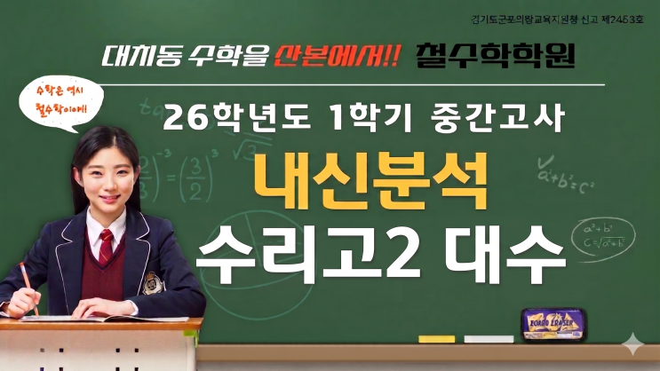 안녕하세요!! 철수학 철쌤입니다!! 26년도 수리고2 대수 1학기 중간고사 내신분석을 시작하겠습니다. 이번 수리고2 1학기 중간고사의 시험범위는 지수 ~ 삼각함수의 그래프 입니다. 수리고스러운 시험이었습니다. 예전에 비해 앞부분 문항의 난이도는 낮아졌습니다. 15번정도까지는 할만한 난이도 였습니다. 16번부터 모고기출 변형이 등장합니다. 지수로그함수와 삼각함수 그래프 관련 문항의 비중이 높아 평소에 그래프를 그려 접근하는 방법의 연습이 필요해 보입니다. 서술형은 2문항이 출제 되었으며 그 중 1번이 할만한 난이도입니다. 객관식 마지막 2문항과 서술형 마지막 문항은 난이도가 높으며 나머지 문항을 해결하느라 시간이 부족했....... <img src="https://blogthumb.pstatic.net/MjAyNjA0MjhfMjkx/MDAxNzc3MzU0MzUxMzM5.GOLlyCPdgtu5qp8Udy8KmmSFxFjBCeaO0Izlt66ENEAg.EZENC-BXEZAicGg26RwMrbmuv5HOzh_i83KrPB9gGLMg.PNG/Gemini_Generated_Image_juu5fojuu5fojuu5.png?type=s3" />