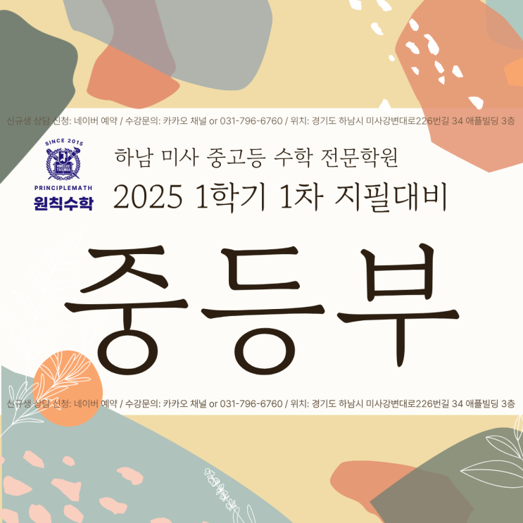 안녕하세요. 하남 미사 중고등 수학전문학원, 원칙수학입니다. ✨ 중등부 1학기 1차 지필대비 시간표 공유드립니다~ 중1 수업 안내 현재 중1 수업은 개별진도반으로 정원 6명으로 구성되어 있습니다. A반, B반 모두 학생 수준에 맞춘 1:1 개별진도입니다. 현재 중1A반은 마감이며, 중1B반은 4자리가 남아있습니다~ 중2 수업 안내 중2A반은 심화 + 기본 반으로 선행 포함이며 중2B반은 기본반으로 현행진도에 집중합니다. 중3 수업 안내 중3A반, 중3B반, 중3B-1반, 중3C반은 마찬가지로 학생 수준별 강의의며, 학교별 강의가 아닙니다. 현재 윤슬중, 미사중, 하남중, 강일중, 미강중, 강빛중, 한홀중, 은가람중, 강동중 학생들이 재원....... <img src="https://blogthumb.pstatic.net/MjAyNjAzMDlfMTM4/MDAxNzczMDQ4MzYwNzYy.I_URAEwE5x6Dnvx6iyCzpZBCS0YLhOqdXw9jp7CknJIg.DAL8y07NeZdcqsB0KG8J2A7ly4YgCwRoslXLZx7tqygg.PNG/2026_%BA%BD_%BD%C3%B0%A3%C4%AB%B5%E5-_%BA%B9%BB%E7%BA%BB_%281%29.png?type=s3" />