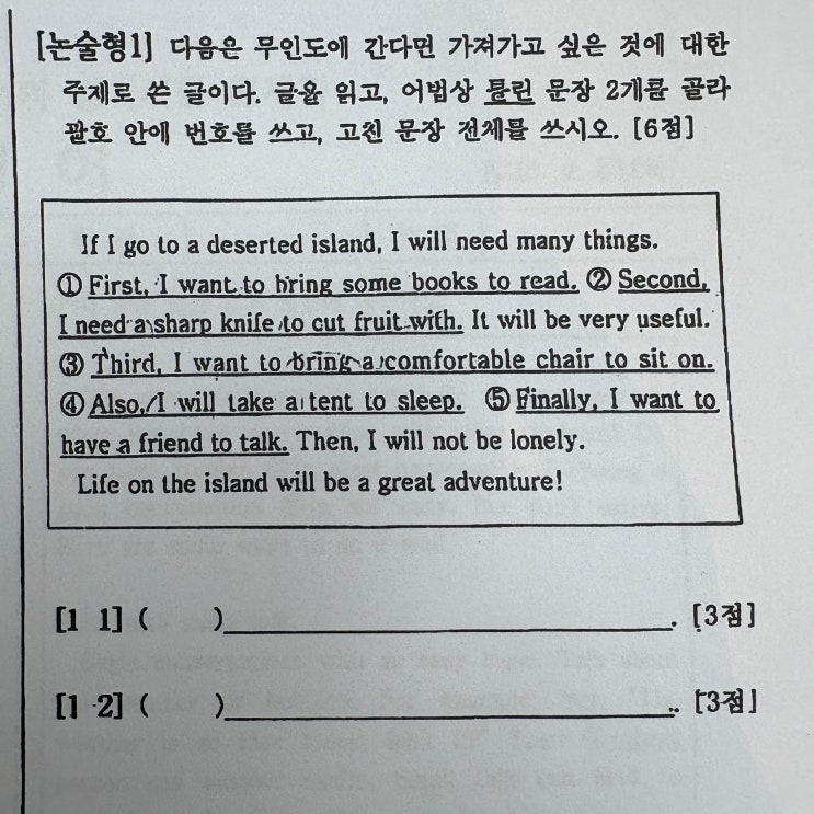 다율중학교 중간고사 유형 분석 (중2 기준) 이번 다율중학교 영어 중간고사는 단순 암기형보다는 문맥 이해 + 문법 적용형 문제 비중이 높았습니다. 특히 논술형은 수동태는 출제되지 않았고, 대신 to부정사 형용사적 용법이 출제되었습니다. ① some books to read - ok ② a sharp knife to cut-ok ③ a comfortable chair to sit on - ok ④ a tent to sleep in ⑤ a friend to talk to 핵심 한 줄 to + 동사 = 앞에 있는 명사를 설명해주는 말 “~할 ___”이라고 해석 예를 들어 book to read = 읽을 책 knife to cut = 자를 칼 앞에 있는 명사를 뒤에서 꾸며주는 역할이라 형용사적 용법이라고 부릅니다. 쉽게 보는 공식 명....... <img src="https://blogthumb.pstatic.net/MjAyNjA0MjhfMTI1/MDAxNzc3MzYzOTIwODQ3.OKN_cU3xKYknemHRydEUPvJzjouGSbIYU48qSTQdPMkg.01Hhi2MWyHz3tA1IeaS0Gy2LagRAcWl5DRm6h4hAMAog.JPEG/IMG_1271.jpg?type=s3" />