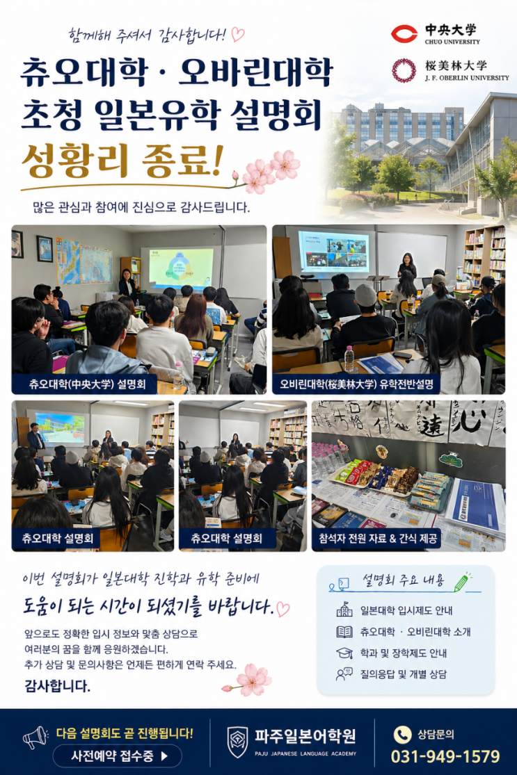 오늘 일본유학 설명회에 참석해 주신 모든 분들께 진심으로 감사드립니다. 특히 Chuo University / J. F. Oberlin University 설명회까지 함께해 주셔서 더욱 뜻깊은 시간이었습니다. 이번 설명회가 일본대학 진학과 유학 준비에 실질적인 도움이 되었기를 바랍니다. 앞으로도 정확한 입시 정보와 맞춤 상담으로 여러분의 꿈을 함께 응원하겠습니다. 추가 상담 및 문의사항은 언제든 편하게 연락 주세요. 감사합니다. 파주일본어학원 드림 <img src="https://blogthumb.pstatic.net/MjAyNjA0MjVfMjc3/MDAxNzc3MTE2OTAyODk1.0LqqY0AOx1YRnLUWBYjuPC7ZJtjCcO0NRVcoIP8MF6kg.P9yDgsEy4lY_FTP5CF8Pl-6RwHm8TI_jcv5Tg63nm3gg.PNG/900_file_00000000994872099c94c9604995b3e6.png?type=s3" />