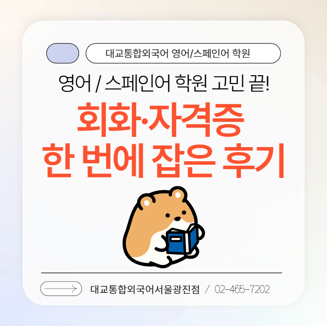 안녕하세요! 성수 영어학원 / 스페인어 학원 대교랭퀴지스퀘어 광진점입니다! “자격증도 따야 하고, 회화도 해야 하고…” 시간은 없고, 어디서부터 시작해야 할지도 모르겠고... 그런 분들이 저희 성수 영어학원 / 스페인어 학원으로 오세요! 저희 학원은 혼자 하기 막막한 걸 1:1 맞춤 수업으로 함께 풀어가는 곳이에요. 원어민 선생님과 실전처럼 말하면서 배우고, 그날 배운 표현은 그 자리에서 바로 말해보는 수업! 바쁜 직장인도, 초보 학습자도 딱 맞는 진도와 템포로 알려드려요. 실전 중심 영어/스페인어 수업 회화부터 자격증까지! ✔ 소수 정예 회화 수업 (1:1 또는 2~3인 이하 소규모 진행) - 원어민 선생님과 직접 말해보는 실전 연....... <img src="https://blogthumb.pstatic.net/MjAyNjAxMzBfNTgg/MDAxNzY5NzgzMTAwMzY3.mxEglYoB-XKL1029iOLWkrXCdmaPmN9TsmhZ2TVhEJQg.TDu327kjPd2qs5kyWYVPlzMd8VHS1JZ7doEKonjBMB4g.PNG/image.png?type=s3" />