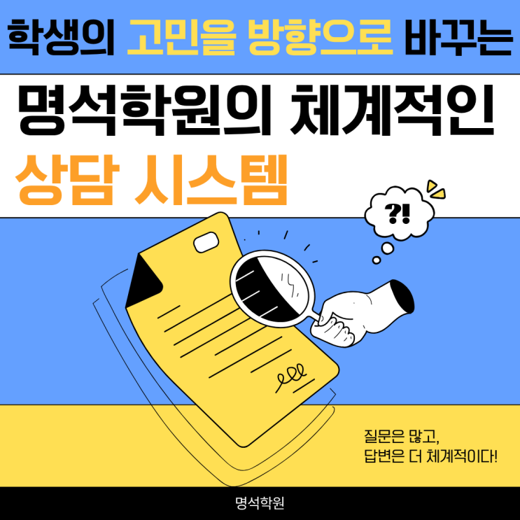 안녕하세요, 성동구 전교권의 선택! 명석학원입니다. 학생 한 명, 한 명의 학습 여정에는 질문과 고민이 늘 함께합니다. “지금 공부 방향이 맞는지?”, “내신 대비는 어떻게 해야 할까?”, “성적이 잘 오르고 있는 걸까?”와 같은 불안과 궁금증은 누구나 겪는 과정입니다. 명석학원은 이러한 고민을 빠르게 확인하고, 개인에게 가장 알맞은 학습 해법을 찾아가는 상담 시스템을 운영하고 있습니다. 오늘은 명석학원만의 체계적인 상담 과정이 어떻게 학생과 학부모님의 학습 성공을 돕는지 자세히 소개드리겠습니다! 명석학원 상담 체계는 어떻게 이루어질까? 명석학원의 상담 시스템은 단발적인 대화가 아닙니다. 학생의 현재 위치를 정....... <img src="https://blogthumb.pstatic.net/MjAyNjAyMDRfMTY5/MDAxNzcwMTkxMzQwMTA1.EQKu-InotTzbzBHp-CP_tI1xtcMOUzKzgRUfJ-CurvYg.SLxFcEdb5CszCberbP5sxXW-zxGRixnUyvVxNSwgvrwg.PNG/%C1%A6%B8%F1%C0%BB_%C0%D4%B7%C2%C7%D8%C1%D6%BC%BC%BF%E4._%287%29.png?type=s3" />