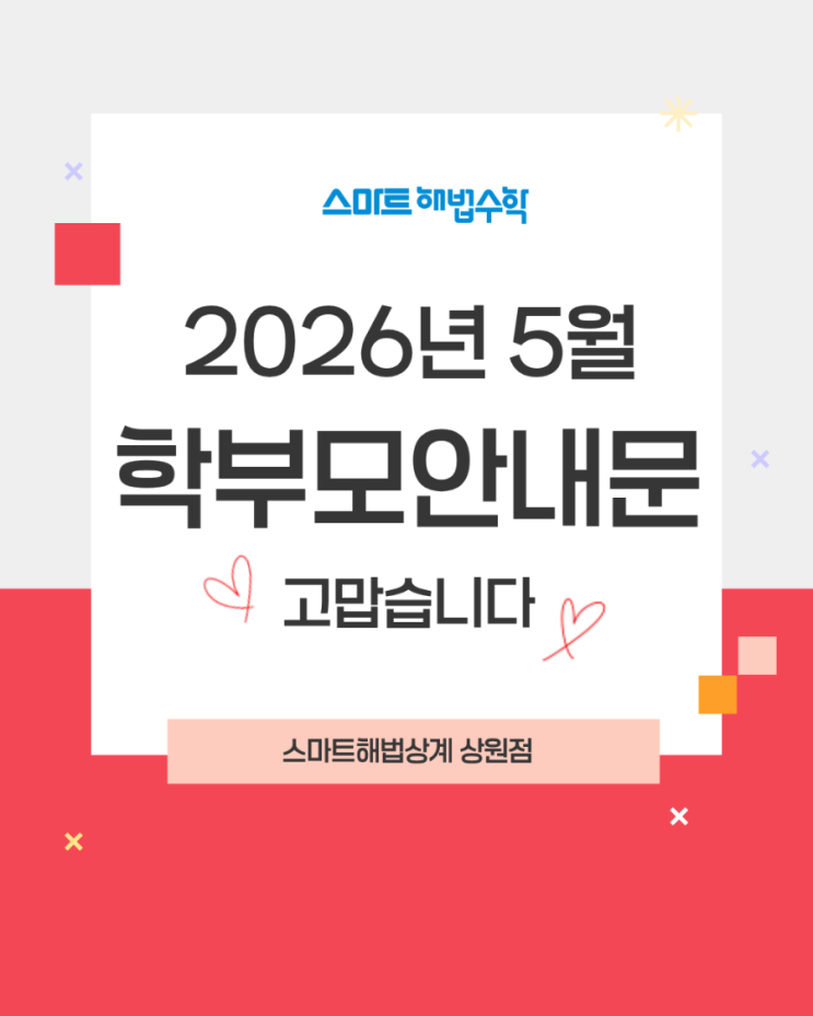 #어린이날행사 #단원평가 #수학학력평가 #상원초앞 #중등수학 #청원초 #데일리테스트 #오답관리 #상계동수학학원 안녕하세요! 가정의 달 5월을 맞아 우리 아이들의 학습 일정을 공지합니다. 바쁜 5월, 아래 일정을 꼭 확인해 주세요! ️ 5월 주요 일정 *휴원 및 이벤트 * 5/1(금): 노동절(휴원) * 5/4(월): 어린이날 이벤트 * 5/5(화): 어린이날 * 5/25(월): 석가탄신일 학습에 차질 없도록 일정을 미리 체크해 주시길 바랍니다. 따뜻하고 즐거운 5월 보내세요! 감사합니다.~~~♡ <img src="https://blogthumb.pstatic.net/MjAyNjA0MjdfNzYg/MDAxNzc3MjUzMDk1MDIy.0PQyqKOR87rNj8P1dh-0Y9tkkuRxDc-Qv3Cg0P1BrIgg.t6mEPLXqNED0aj83tlFOSskZvRO14bwRPIgCd9OyNlYg.PNG/900_1.png?type=s3" />