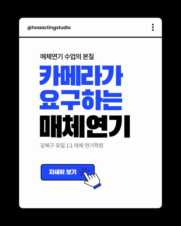 안녕하세요 호아연기학원입니다 :) 지금 연기를 하고 있는 여러분! 혹시 이런 고민 해보신 적 있으신가요? 1.연기는 열심히 하는데 결과가 없다 2.오디션만 보면 긴장된다 3.카메라 앞에서 어색해진다 4.감정이 잘 안살아난다 문제는 '재능'이 아니라 '방법' 일 수 있습니다 매체연기는 TV, 영화, 유튜브, 등 카메라 기반 연기로 무대연기와 달리 미세한 표정,호흡,리액션과 카메라 앵글 이해가 핵심입니다! 편집과 컷이 흐름을 만들고 상대의 말을 듣는 0.5초 같은 '듣는 순간'이 더 중요해질 때가 많습니다 그래서 매체연기는 방식부터 다릅니다 ✔️시선 처리 ✔️미세 표정 ✔️호흡 조절 ✔️감정 타이밍 호....... <img src="https://blogthumb.pstatic.net/MjAyNjAyMTBfMjAg/MDAxNzcwNzA3MTI0NjY5.CF3uYB5toOu9WBpPHUYSFuI5neysvnm1MeVD2DbDonEg.p9m7bsGojOnQEDbKQ5RXkTYg3k7BfGMSK3ihg2B_Lagg.PNG/1.png?type=s3" />
