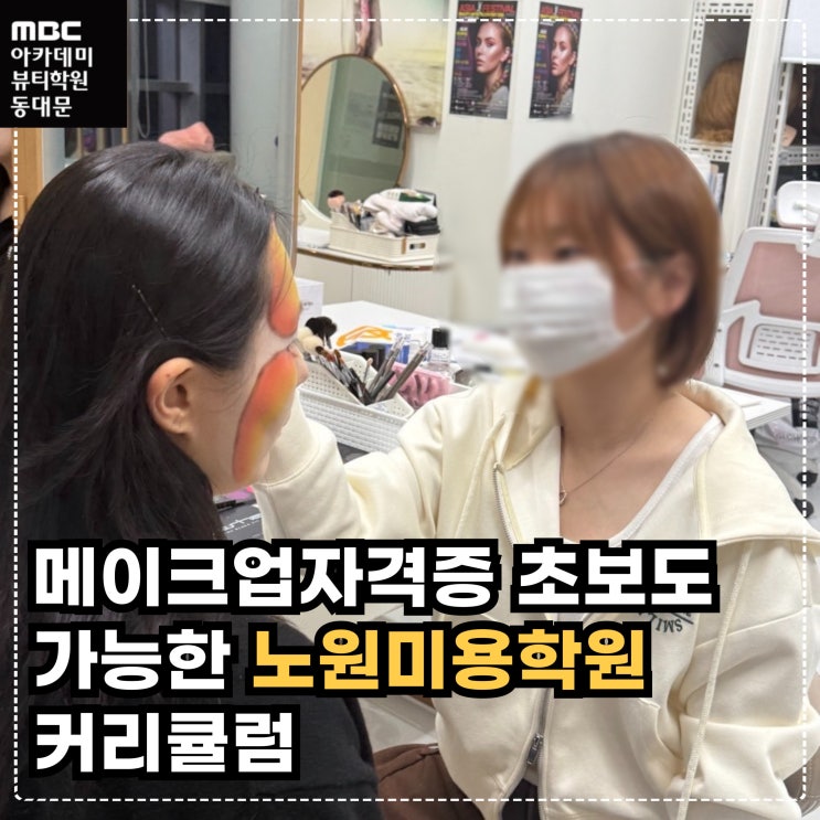 안녕하세요! 노원미용학원 MBC아카데미뷰티 입니다 :) 오늘은 메이크업에 관심은 있지만 어디서부터 시작해야 할지 막막한 분들을 위해, 메이크업자격증 커리큘럼을 이야기해보려고 해요. 저도 처음에는 “메이크업자격증? 나 같은 초보도 가능할까?” 이런 고민부터 시작했거든요. 유튜브 보면서 따라 해보다가 이건 혼자서는 한계가 있겠다 싶어서 노원미용학원을 알아보게 됐어요. 메이크업자격증 준비를 제대로 하고 싶다면 노원미용학원 선택이 꽤 괜찮은 방법이었어요. 메이크업자격증, 초보도 가능한 이유 많은 분들이 메이크업자격증은 어느 정도 실력이 있어야 도전할 수 있다고 생각하시는데요, 사실은 완전 초보도 충분히 가능해요. 특....... <img src="https://blogthumb.pstatic.net/MjAyNjA0MjlfMjEw/MDAxNzc3NDQ4NTY1Mzc0.KQrLesoR7D1-JtULTDgvEoApD9WRPl_eP4YZZWlku2Mg.xKR9-21OzaDZaua1YpW2lBJ8BK27xOckpta7OPypEkYg.JPEG/%B3%EB%BF%F8.jpg?type=s3" />
