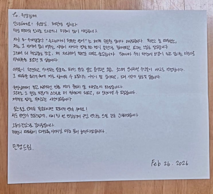 안녕하세요? 하루 수업이 타 프로그램의 2~3주에 비견되는 집약성과 재미를 가지고 있는 영어학원 무엇보다 아이들이 학원 오는 것을 기다리고 공부를 열심히 해나가는 학원. 도봉구 방학동 영어도서관 올리비아의 행복한 영어입니다. 오늘 수업 시간에 한 친구가 닭똥 같은 눈물을 뚝뚝 떨어뜨리며 갑자기 울기 시작하네요. 깜짝 놀라서 다가가서 왜 그래? 무슨 일이 있어? 라고 물어보니 잠시 망설이던 이 친구가 ‘우리 엄마가 제가 뭐 잘못했을 때 ‘올리비아의 행복한 영어’ 끊는대요’ ‘저는 학원이 너무 좋아요’ ‘게임보다 더 좋아요’라고 이야기를 하는거예요. 어른이 야단을 치면서 충분히 할 수 있는 말인데 진심으로 믿어버리고....... <img src="https://blogthumb.pstatic.net/MjAyNjAzMTJfMTA5/MDAxNzczMzE5NTY2MDMy.8l-JMo1j8i98SRX0A0VKX8yjcw54jrv4R29QjiB07aYg.KuIHim2Emu-xVykUbwZbNrZCDVwiCt_y_HgzkoPBBXYg.JPEG/%B9%CE%B0%E6%BC%B1%BB%FD%B4%D4_%C6%ED%C1%F6.jpg?type=s3" />