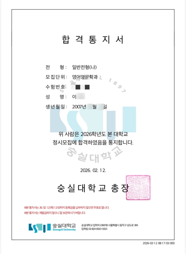 초6 부터 덕원여고 고등부까지~!, 숭실대 합격! 올해도 정말 기쁜 소식을 하나 전하게 되었습니다. 이번에 숭실대학교 영어영문학과에 합격한 우리 친구 이야기입니다. 이 친구는 초등학교 6학년 때 처음 학원에 왔던 학생입니다. 키도 작고 수줍음도 많았던 아이가 어느새 고등학교를 거쳐 대학 합격 소식을 전해주니, 시간이 얼마나 빠른지 새삼 느끼게 됩니다. 처음부터 영어를 잘했던 건 아닙니다. 하지만 영어를 좋아하는 마음은 분명히 있었어요. 수업 시간에도 영어 표현 하나를 배우면 “이건 왜 이렇게 쓰나요?” 하고 궁금해하고, 숙제도 늘 성실하게 해오는 학생이었습니다. 고등학교에 올라가서는 내신 준비와 수능 공부를....... <img src="https://blogthumb.pstatic.net/MjAyNjAyMTJfMjY3/MDAxNzcwODc3NjA0MDE3.EuQ67hUvIewowWc3uA6RP3rGZgGe5VsFd9Ph03NHhZog.Kpn5APyRWpxhOWplEsYLBgMHaObMQAxYpGpo2TLzEo8g.JPEG/KakaoTalk_20260212_143621638.jpg?type=s3" />