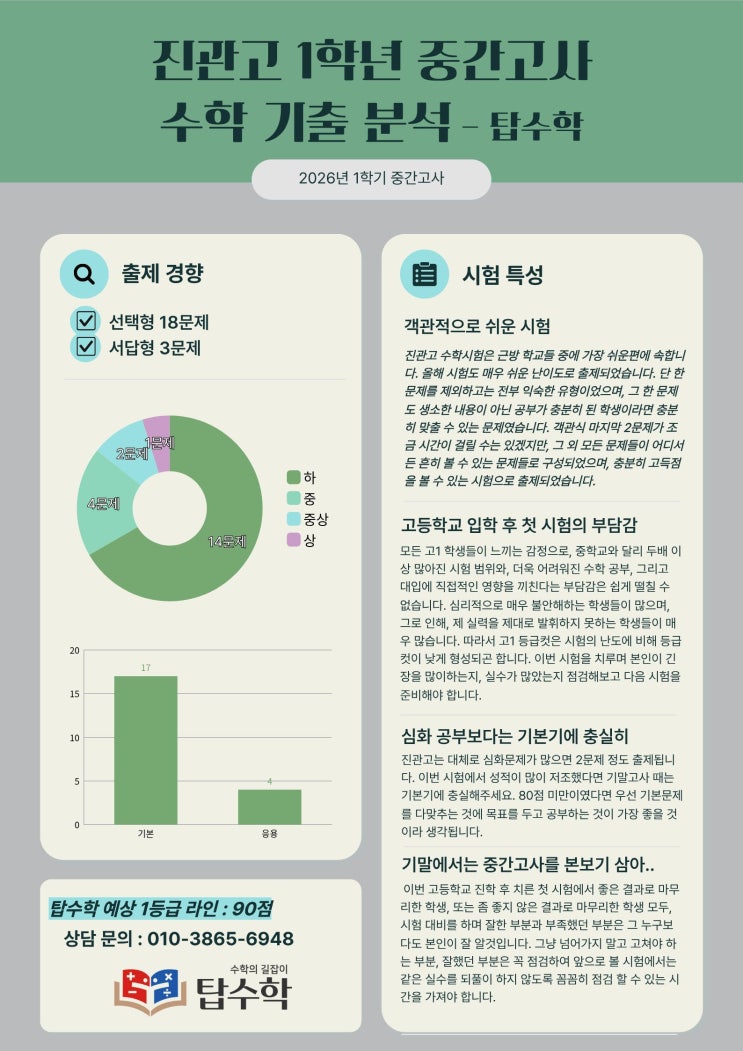 은평구 신도고 1학년 수학 중간고사 내신 기출 경향에 대한 분석입니다. 고등학교 진학 후 첫 시험, 그중에서도 양도 많고 부담이 심한 수학과목을 치르느라 정말 고생 많았습니다. 이번 진관고1 시험의 경우, 작년(25년)과 비슷하게 출제되었습니다. 학생들이 느끼기에 까다로운 문제는 2문제 정도였으며(2문제 모두 객관식), 서답형의 경우 정말 쉽게 출제되었습니다. 해당 2문제를 제외하고 다 맞춘다면 충분히 1등급이 나올 수 있으리라 생각됩니다. 주변 학교들은 부교재(선일, 예일) 프린트(신도,선정) 양이 꽤나 많은 편입니다. 다만, 진관의 경우 이번에도 적은 양의 프린트를 나눠주었으며, 문제수, 난도가 높지 않았습니다. 따라서 교....... <img src="https://blogthumb.pstatic.net/MjAyNjA0MjdfMjUz/MDAxNzc3MjY5NTcxMTQ5.aCgQ0gVVuINF05jAU5Vl8w4r9hzPbx5Loc76XVIjLAcg.MIfL0gT2jWngKCQHN5KqOALpq41M422vbd7yb2FJKIAg.JPEG/%C7%D0%B1%B3_%B1%E2%C3%E2%BA%D0%BC%AE_%282%29.jpg?type=s3" />