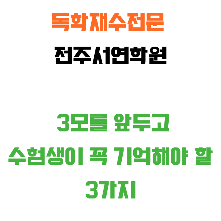 안녕하세요 #전주재수학원 #전주독학재수학원 #전주서연학원 입니다 다음 주에 올해 첫 전국 연합고사를 실시합니다. 항상 '첫단추'를 잘 끼어야 되듯, 3월 모의고사 시험은 수험생에게 매우 중요한 시험입니다. 중요한 시험을 앞두고, 수험생들이 기억해야 할 3가지에 대해 아래와 같은 내용의 편지를 써서 학생들에게 나누어 주었습니다. 다음 주에 올해 첫 전국 연합 모의고사를 실시합니다. 수험생이 준비가 덜 되었다거나, 컨디션이 좋지 않았다는 이유로 모의고사를 소홀히 대하는 자세로는 8개월이라는 단기간의 시간에 좋은 성적이 나올 수 없습니다. 다른 시험도 그렇지만 수능은 더더욱 준비하는 공부 시간도, 시험 시간도 많....... <img src="https://blogthumb.pstatic.net/MjAyNjAzMjBfNjUg/MDAxNzczOTk0NjcyNDc5.f9S91nicLmvIp-CFqNm1dJpxD8a0yfbD5a1hEex4P6Mg.IVV-MUjDGCDS8iZmeUljzzfe85FWEHdDEzvF-23QKn4g.PNG/Never_give_up_instagram_post__%2820%29.png?type=s3" />