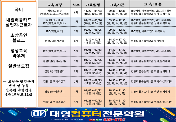 익산컴퓨터 모현동 대영컴퓨터전문학원 교육생 모집 이곳에서는 내일배움카드를 활용한 다양한 교육 과정이 운영 중이며, 실업자, 재직자, 소상공인 모두 수강이 가능합니다. 또한 평생교육 바우처를 통해 일반생도 지원받을 수 있어, 학습의 기회를 놓치지 마세요! 지원 대상 취업 준비 중인 실업자 재직 중이지만 역량 강화를 원하는 근로자 일반 성인 학습자 (평생교육 바우처 이용 가능) 국비지원 교육과정 일정표 수강신청 방법 내일배움카드 소지자는 고용24 사이트 또는 방문 신청 소상공인·일반인은 평생교육 바우처 이용 가능 좌석 제한 있어 선착순 마감! 교육장 위치 안내 전북 익산시 고현로 114, 수협건물 4층....... <img src="https://blogthumb.pstatic.net/MjAyNTEyMTZfMTAy/MDAxNzY1ODYyOTA1NTUz.yDuJTzoPmqaheU15gXOCeQaknzr8y3rLMcc3wkUvbvcg.4WVNVPgAYnS1mU8M5dKUxbXjsT3NPooTtminZT8u5mIg.PNG/0105.png?type=s3" />