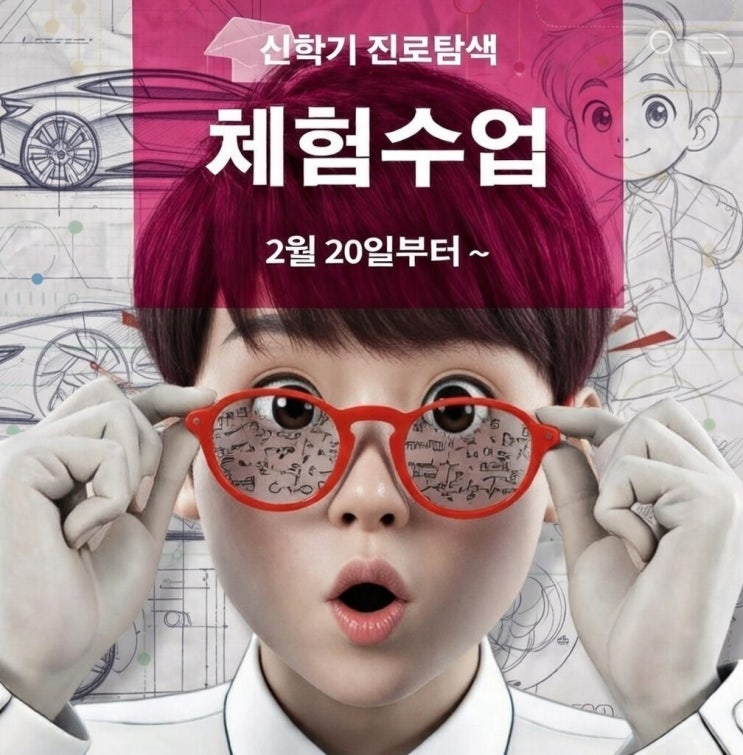 2026년 신학기 진로탐색 체험수업 모집 ★ 대 상 ★ 디자인 · 만화 · 애니메이션 전공에 관심있는 중 고등학생 친구들 ★ 일 정 ★ 2026년 20월 20일 설날 이후부터 미대입시 진로탐색 체험수업 내용 1, 수업목표 2, 미술대학 전공소개 3. 체험 활동 내용 4. 미대입시의 핵심 요소 ㅋㅋ AI가 오타를 냈네요^^ 아직은 5. 미대입시 준비과정 학년별로 체계적인 계획과 실행이 필요합니다. 6. 체험수업을 통해 알아야 할 것 미대입시는 단순히 그림만 잘 그려서 진학할 수 있는 곳이 아님을 알아야 합니다. 성적관리도 매우 중요하고 전형방법에 따라 반영 요소, 반영교과 등 이 학교마다 상이하므로 저학년 때부터 철저한 준비와 꾸준한 노력으로 체....... <img src="https://blogthumb.pstatic.net/MjAyNjAyMThfMjIx/MDAxNzcxMzk2MDg4MTMz.wI0yvQ7LoQul8XFkMuZoro-5U8vdM1tWFWlE6yUJ6OYg.HjoPnas8POe7pezuosf3XYE_QgnJMNHjmuCsZ5yPkOsg.JPEG/999.jpg?type=s3" />