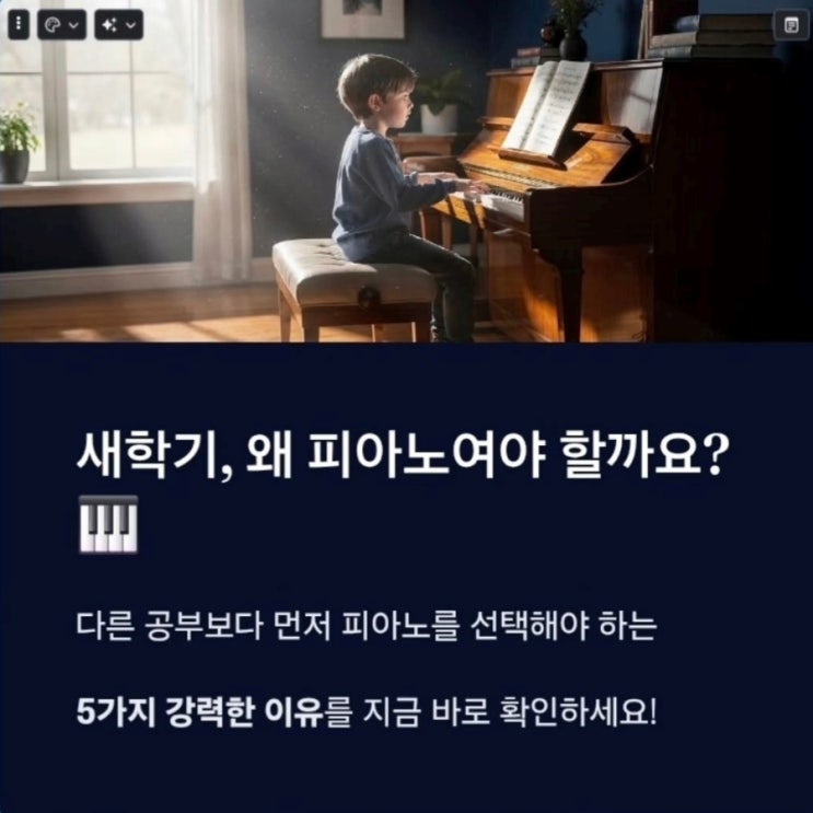 우리아이가 피아노를 꼭 배워야 하는 5가지 이유! 1. 피아노는 두뇌 발달을 촉진한다. 2. 집중력과 자기 조절 능력을 키워준다. 3. 스트레스 해소와 정서 안정에 도움을 준다. 4. 꾸준한 연습은 성취감과 자신감을 만들어 준다. 5. 평생 함께할 수 있는 특별한 재능을 갖게 된다. <img src="https://blogthumb.pstatic.net/MjAyNjAzMjBfMjM0/MDAxNzczOTY1MjMwMDIy.y7mGY69FXTlahV8q-D49eEGy_lb_MKdtba7Ye6pBA18g.aVZCihOGioWpCFvPaOspAgRGHyxRHrzcGh_zAff7YQUg.JPEG/900%A3%DFScreenshot%A3%DF20260320%A3%DF085615%A3%DFInstagram.jpg?type=s3" />