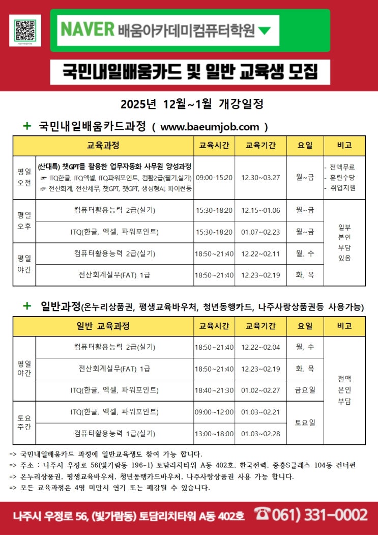 2025년 12월~01월 국민내일배움카드 및 일반교육생 모집합니다.