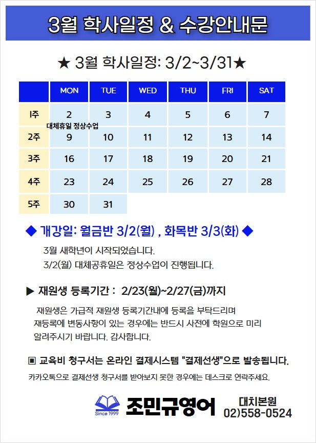 대치동개별맞춤영어학원, 조민규영어: 3월 학사일정&수강등록 안내