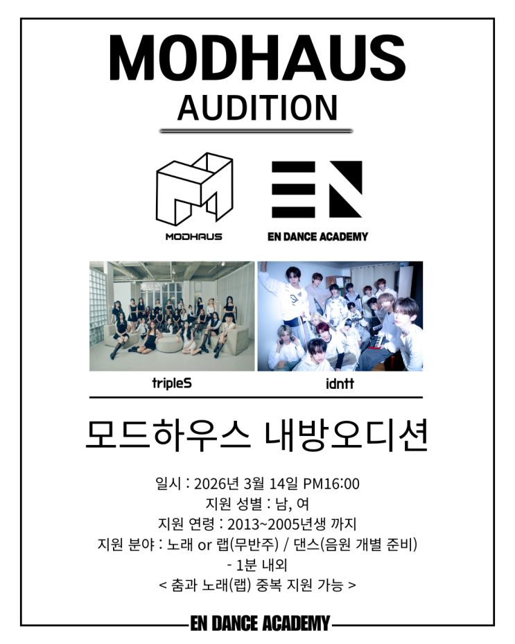 MODHAUS 내방 오디션 안내 EN DANCE ACADEMY × MODHAUS 아이돌을 꿈꾸는 친구들에게 또 하나의 기회가 찾아왔습니다. 2026년 3월 14일, MODHAUS 내방 오디션이 진행됩니다. 이번 오디션은 학원생뿐 아니라 외부 지원자도 신청 가능합니다. 오디션 일정 2026년 3월 14일 (토) ⏰ 오후 4시 지원 대상 • 2013년생 ~ 2005년생 • 남 / 여 모두 가능 • 외부 지원 가능 지원 분야 ✔ 노래 또는 랩 (무반주, 1분 내외) ✔ 댄스 (음원 개별 준비, 1분 내외) ✔ 춤 + 노래(랩) 중복 지원 가능 짧은 1분이지만, 그 안에 자신의 색을 담아야 합니다. 오디션 진행 방식 • 접수 순서대로 진행 • 입장 후 간단한 자기소개 (예....... <img src="https://blogthumb.pstatic.net/MjAyNjAyMjNfNjQg/MDAxNzcxODI0MjE3MjMx.dVn-ix9CVN6UTY96bZA09aAd8fm1ON_DumdnI7JiMOYg.pRr-JT3ZtZ18ENFWaK_TdwkNW5uUazNkolT-4ADwlDMg.PNG/MODHAUS_%B3%BB%B9%E6%BF%C0%B5%F0%BC%C7.png?type=s3" />