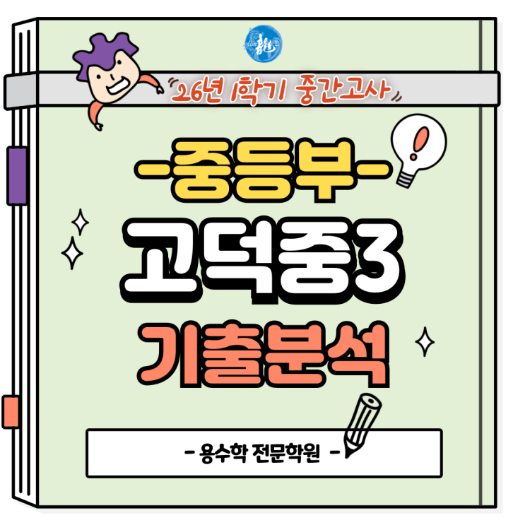 고덕중학교 3학년 2026학년도 1학기 중간고사 수학 시험분석 고덕중학교 3학년 수학 (시험범위: 제곱근 ~ 인수분해) 안녕하세요. 용수학전문학원입니다. 중간고사가 끝난 뒤 학생들이 많이 보인 반응은 이렇습니다. “제곱근 계산은 아는 내용인데 실수가 났어요.” “인수분해는 공식은 외웠는데 식이 바로 안 보였어요.” “뒤쪽 문제는 시간이 부족했어요.” 이번 고덕중 3학년 1학기 중간고사는 제곱근의 계산 정확도와 인수분해 공식 활용 능력을 중심으로 출제된 시험이었습니다. 초반부는 제곱근의 뜻, 근호 안의 수 정리, 제곱근의 대소 관계, 근호를 포함한 계산 등 기본 개념을 확인하는 문항이 많았습니다. 하지만 중후반부로 갈수록....... <img src="https://blogthumb.pstatic.net/MjAyNjA0MzBfODIg/MDAxNzc3NTQ4MjAyMzMz.Sa54VnTAIE3Z8s7KFqU-m4ZObRufKUYSZ-EQ38LcTbog.JKmDY95roN36pDSVtvFyD9pVOI_TLV9DXHwDqsdv7ugg.PNG/%B0%ED%B4%F6%C1%DF3%BC%F6%C7%D0_%BF%EB%BC%F6%C7%D0.png?type=s3" />