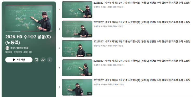 "2026-고3-수1수2공통(S)-(영상5개)" [노동일T] "형설학원 매쓰올"(유튜브채널)을 통해 주요문항해설 및 수학수업영상을 언제든지 시청 및 다운로드 가능합니다. 강의를 다시 보면서 모르는 개념이나 해결하지 못한 문제들을 영상을 통해 재학습 하므로써 학습의 누수 없이 탄탄한 실력을 갖을수 있도록 도움을 받을수 있습니다. 또한 "자기주도적 학습습관"을 들이는데도 효과적 입니다. 형설 학원 수업문의 신청 ▶ 수업문의신청 콜백시간 : 월~금 13~21시(유선상담 전일가능) 형설 학원 카톡문의 ▶ 카톡채널 운영시간 : 월~금 13~21시(유선상담 전일가능) 형설 학원 홈페이지 www.hsmathall.co.kr 형설 유튜브....... <img src="https://blogthumb.pstatic.net/MjAyNjAyMTJfMTM0/MDAxNzcwODkzMDYzODMz.aqqvDmVhFmAWkSJl5DEOlFYwo46ipZ1cCALhm4-Who8g.J_7huAdFqEKwXdHASUAepHTyyOhfz9nMTxeYwD4dVXEg.PNG/image.png?type=s3" />