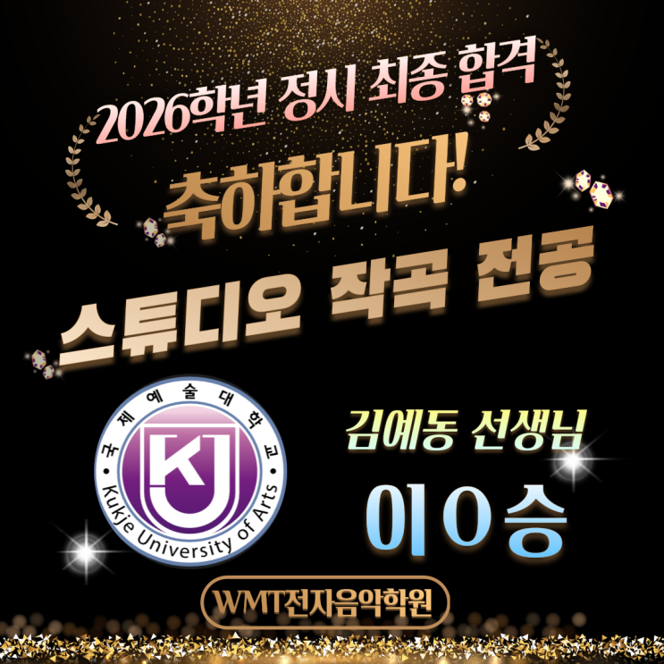 ❤️ 국제예술대학교 실용음악학부 스튜디오 작곡 전공 정시 최종 합격 이O승 열심히 준비하여 값진 결과를 얻어낸 우리 학생들! 정말 축하합니다~☺️ ✨“Youth & Education”✨ 전문적인 커리큘럼과 신뢰 깊은 선생님들로 구성된 WMT전자음악학원에서 2025학년도 원생을 모집합니다. [ 모집 과목 ] 작곡ㅣ전자음악ㅣ보컬ㅣ디제잉 피아노ㅣ전통화성학ㅣ재즈화성학 전문 음향 #미디 취미부터 “전문과정”까지 수강 가능 + #앨범제작 까지 함께 할 뮤지션 환영합니다 #전자음악 #미디입시 #작곡 #DJ #음향 #뮤직프로덕션 #전문프로듀싱 - 입시와 전문 프로듀서 및 엔지니어 양성 교육 학원 - 다년 간 다수의 합격자 배출....... <img src="https://blogthumb.pstatic.net/MjAyNjAyMDJfMjUw/MDAxNzcwMDEwNzA2OTA0.hEEZpMEycYpgDc-rL_4bCxNVEH07C_nUkEJuJZ4GQhQg.u4XhY98eRO9pzN3NVSt5vDWW6zofWRlkkd7CipY4p50g.PNG/%3F%A0%9C%EB%AA%A9%EC%9D%84-%3F%9E%85%3F%A0%A5%3F%95%B4%EC%A3%BC%EC%84%B8%3F%9A%94_-010.png?type=s3" />