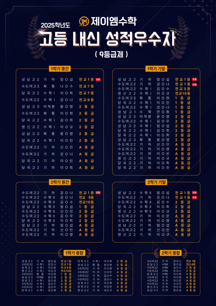 [대방동수학학원 / 제이엠수학] 2025학년도 고등 내신 성적우수자