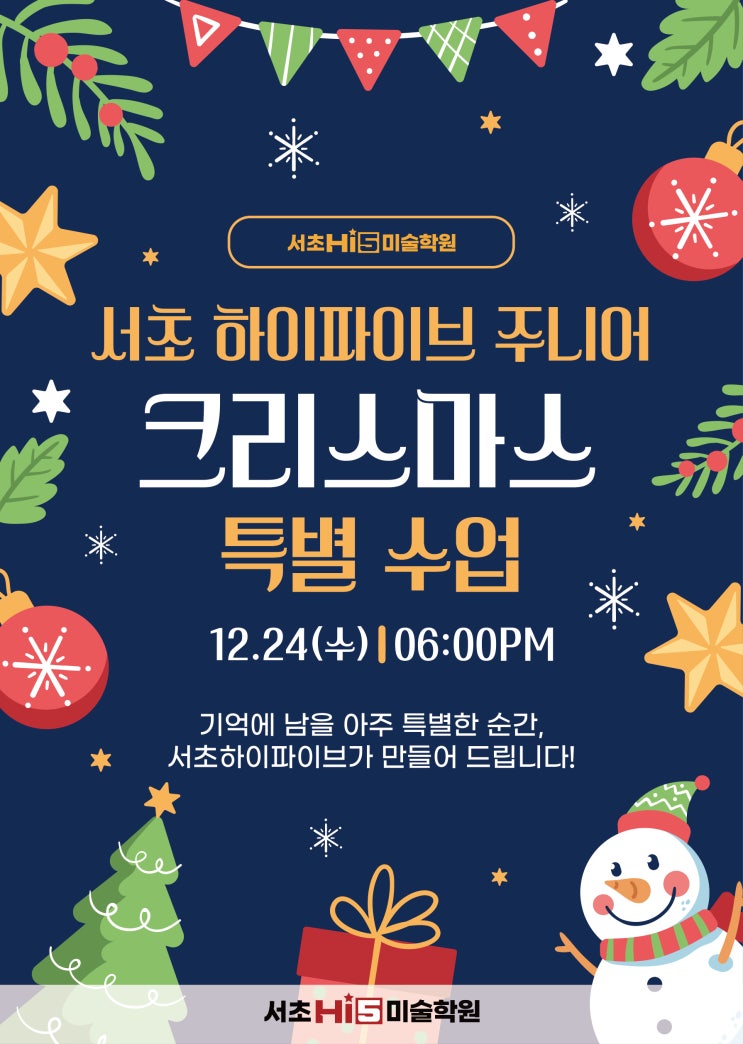 안녕하세요 서초 하이파이브 미술학원입니다. 남녀노소 두근두근 설레는 크리스마스가 코앞으로 다가왔어요~! 크리스마스를 맞아 서초 하이파이브미술학원에서는 아이들에게 기억에 남는 하루를 선물하고자 크리스마스 오픈 클래스를 준비했습니다! 크리스마스 특집 오픈 클래스 안내 주니어 프로그램 고등반 프로그램 이번 오픈 클래스는 학생들이 직접 참여하는 체험형 수업으로 재원생뿐만 아니라 누구나 참여 가능 하니 크리스마스에 추억을 남기고 싶은 학생 들, 미술에 관심이 있는 학생 들은 아래를 통해 신청해 주세요^^ ▼ 초 · 중등 오픈 클래스 신청하기! 당일 방문 (방명록 작성) ▼ 고1~고3 오픈 클래스 신청하....... <img src="https://blogthumb.pstatic.net/MjAyNTEyMjNfNDEg/MDAxNzY2NDg1MDY5ODEy.dlA8iwDGTtER46PG33uAUVa83hj6hEmv-iShGo6cz7Eg.gOnzN__GLY1Rt9Vrgs9mX-DCpjEqxo5ZC4LdLPNepWQg.JPEG/KakaoTalk_20251216_181518261_01.jpg?type=s3" />