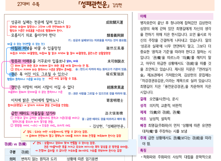 성패관천운 경(經) vs 권(權) 정처관군동 【제1부】 김상헌 「성패관천운」 15문항 1 [ ○ , × ] “성공과 실패는 천운에 달려 있으니”는 결과를 예측할 수 없다는 한계를 인정하면서, 그러므로 결과보다 ‘의(義)’를 우선해야 한다는 논리의 전제이다. 답: ○ 해설: “성패관천운”은 체념이 아니라 ‘결과는 통제 불가하니 원칙(의)을 지키자’는 논리의 출발점입니다. 2 [ ○ , × ] “모름지기 의로 돌아가야 한다”에서 ‘모름지기’는 선택의 여지가 없는 필연성을 강조하는 표현으로, 최명길의 ‘상황에 따른 권(權)’ 사용과 정면 대립한다. 답: ○ 해설: ‘모름지기’는 ‘반드시, 마땅히’라는 뜻으로 절대적 당위성을 나타내며, 이는....... <img src="https://blogthumb.pstatic.net/MjAyNjAyMjJfMjAw/MDAxNzcxNzY0NTk4ODgz.Kj7zGK9I9Avs6exHKEvCCow4DqZGpasPzKnXPcHFBfgg.2OSCe7jVNmZktm3zS4mwcI7_XidooM9JKWzfm5XrcXUg.PNG/image.png?type=s3" />