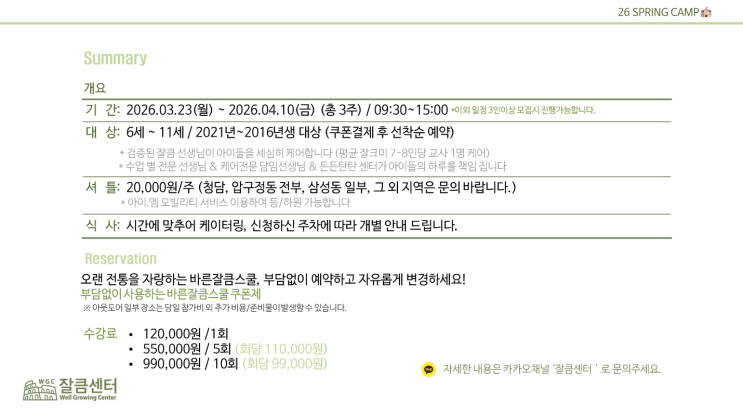 국제학교 Spring Break 특강 : 바른잘큼스쿨_Spring Camp 17기 바른잘큼스쿨 Coupon️ 하루 단위로 신청 가능한 수업이 있다고? 쿠폰제 운영으로 원하는 일정 쏙쏙 골라 신청하세요!☺️ ▶바른잘큼스쿨 쿠폰 옵션 - 10회쿠폰 : 99만원(회당 9만9천원) - 5회쿠폰 : 55만원(회당 11만원) - 1회쿠폰 : 12만원 셔틀운행 이용일수와 상관 없이 주/20,000원으로 이용가능 청담동, 압구정동. 삼성동 일부 왕복운행 (이외 지역은 일부 오전등원 이용가능. 별도 문의 주세요) ✒️운영규정✒️ ☑️ 쿠폰 구매 후 참여일 예약 (참여일로부터 3일 전 예약마감) ☑️ 예약 마감 이전까지 자유로운 신청 및 일정 변경 가능 (마감된 일정은 변경....... <img src="https://blogthumb.pstatic.net/MjAyNjAzMTJfMjI4/MDAxNzczMjgzMDI0NDU5.-P_-mz5k_xQtqMRJM4NsuoenJwIV-6iMn8E6VTk3neIg.7iIzd9349IETz1aj0UVGAlMKXRsGnV0rwBPIBY0BM78g.PNG/image.png?type=s3" />
