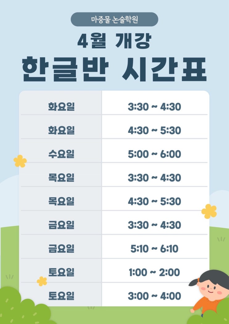 4월 개강 한글반 시간표 안내