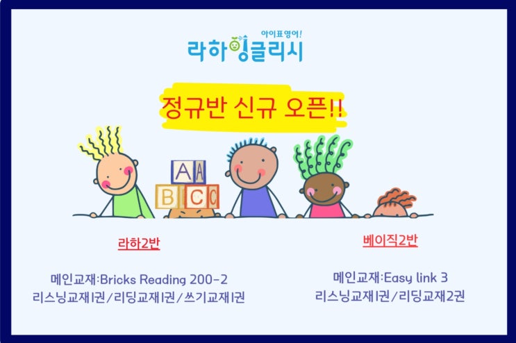 안녕하세요. 원서읽기 No.1 아카데미 No.1 라하잉글리시 개포직영원입니다. 3월 새학기를 맞아 초등부 정규반 신규 개강반을 오픈하며, 신학기 신규생이벤트를 진행 예정입니다. 정규반은 1~2월에 상담 문의가 가장 많아 새 학기 전 시간표 및 반 편성이 조기 마감될 수 있습니다. 원활한 반 배정을 위해 사전 상담 후 신청을 권장드립니다. 3월 신규 개강 총 2반 OPEN 정규반 등록 절차 테스트 및 상담 예약 (전화 / 문자 / 네이버 예약) 레벨 테스트 학부모 상담 반 배정 첫 수업 시작 라하잉글리시 프로그램 초등부 정규반 클래스(월수금) 개별 코칭 영어도서관 1:1 맞춤 중등 문법·독해 라하잉글리시는 정규반 수업 중에도 학생에게 필요한 부....... <img src="https://blogthumb.pstatic.net/MjAyNjAxMTZfMjg3/MDAxNzY4NTI5NzcwMDcz.fBuET5hTCJHDNfepx8ddE74Y3H5qnFqsVNUtSDsQBDcg.hr8q6YEIwQ6MRST6qTvBJCwXi9SEc2PmAksICy40KUQg.JPEG/KakaoTalk_20260116_111424974.jpg?type=s3" />