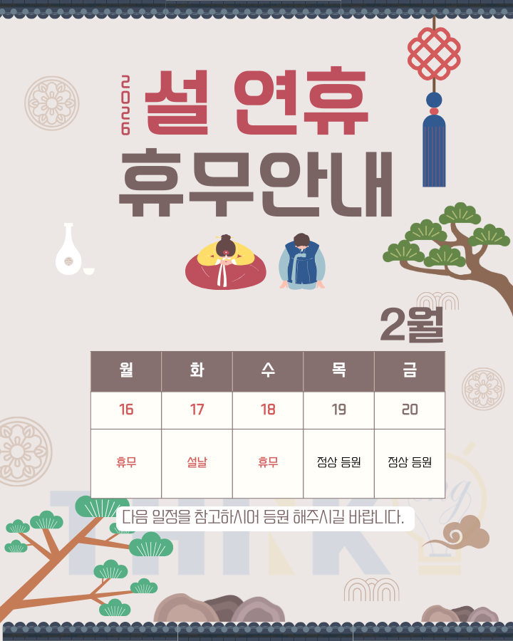 2026년 2월 설날 연휴 휴무 안내|띵킹 어학원 안녕하세요. 띵킹 어학원입니다. 다가오는 2026년 2월 설날 연휴를 맞아 학원 휴무 일정을 안내드립니다. 아래 일정을 참고하시어 등원에 착오 없으시길 바랍니다. ■ 설날 연휴 휴무 일정 2월 16일(월) ~ 2월 18일(수) : 학원 휴무 2월 19일(목) ~ 2월 20일(금) : 정상 등원 연휴 기간 동안 충분한 휴식과 가족과의 소중한 시간을 보내시길 바라며, 연휴 이후에는 더욱 알찬 수업으로 찾아뵙겠습니다. 2026년에도 아이들의 영어 교육을 위해 항상 최선을 다하는 띵킹 어학원이 되겠습니다. 함께해 주시는 모든 학부모님과 학생 여러분께 진심으로 감사드립니다. 감사합니다. <대치점 문의하기&g....... <img src="https://blogthumb.pstatic.net/MjAyNjAxMjNfMTE3/MDAxNzY5MTYzNDM2MzY5.hKueDK2z-VQAi4yOM7U96SOaVbPyCiVoHHM6cRRLUFkg.pEGsvWAAwN0MwfQ5BlQj1OOa8dzmYQJFMRCOm__Kvzsg.PNG/%B6%F2%C5%B7_%B8%F0%B9%D9%C0%CF_%B9%F6%C0%FC__2%BF%F9_%BC%B3%BF%AC%C8%DE_%C8%A8%C6%E4%C0%CC%C1%F6_%B9%E8%B3%CA%BF%EB.png?type=s3" />